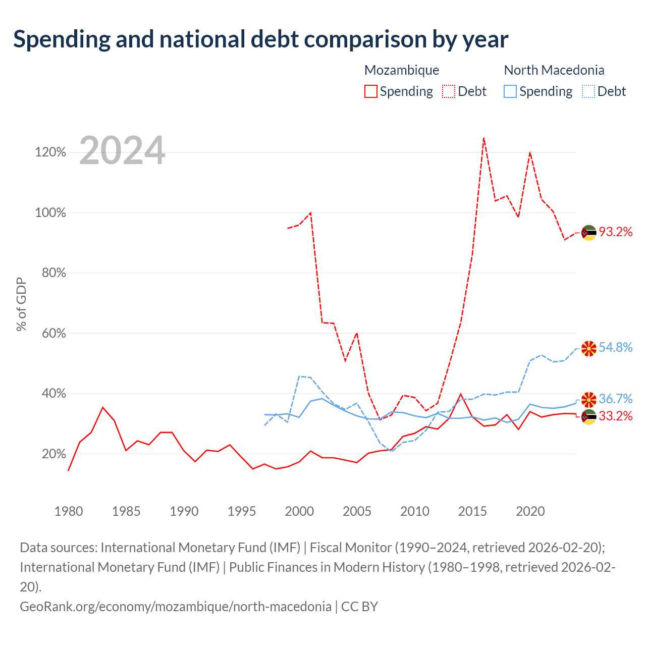 Mozambique has $21.2B in government debt (93.2% of GDP), compared to $9.3B (54.8% of GDP) in North Macedonia.