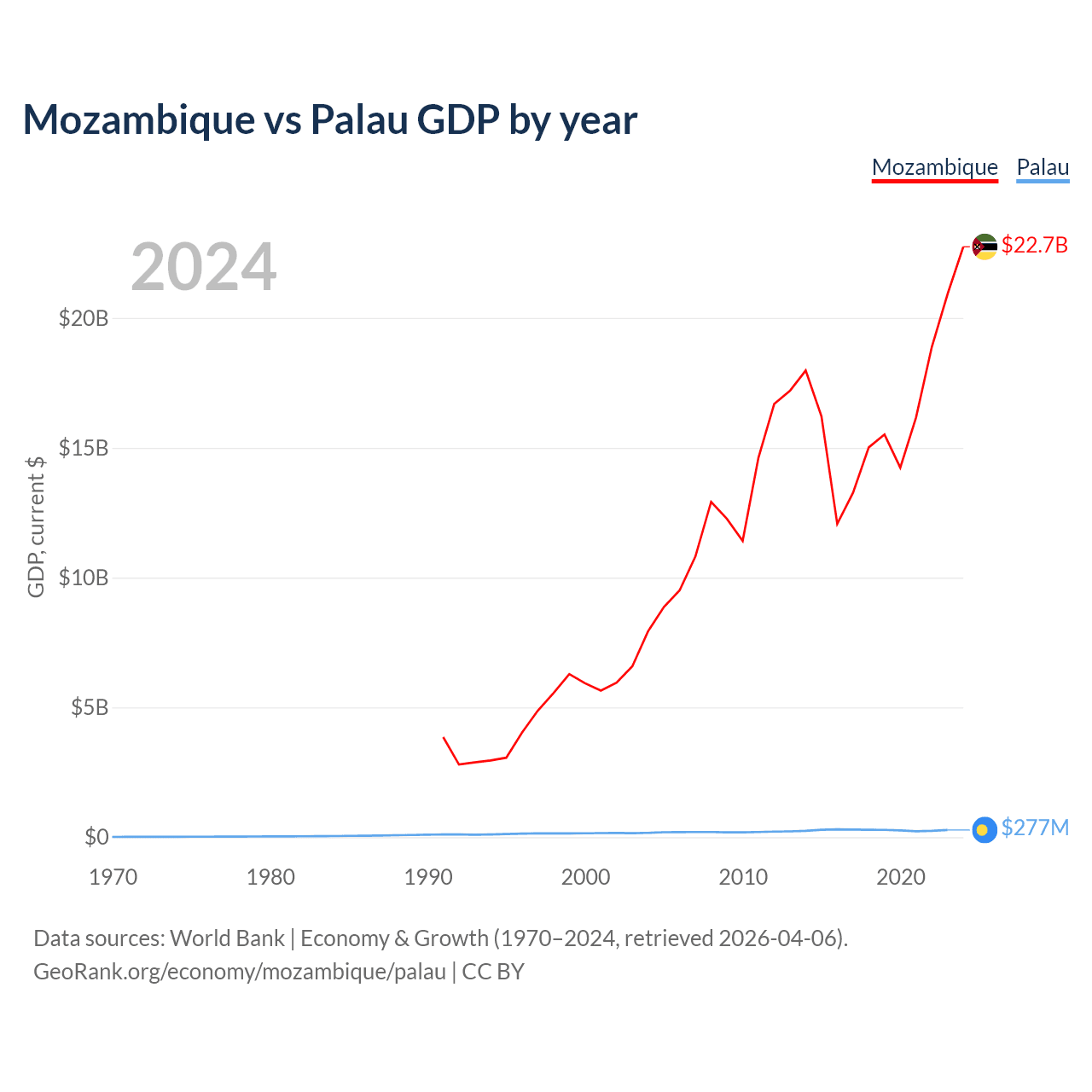 Mozambique has a GDP of $22.7B compared to $277M for Palau, ranking 123/197 and 194/197 by economy size, respectively.