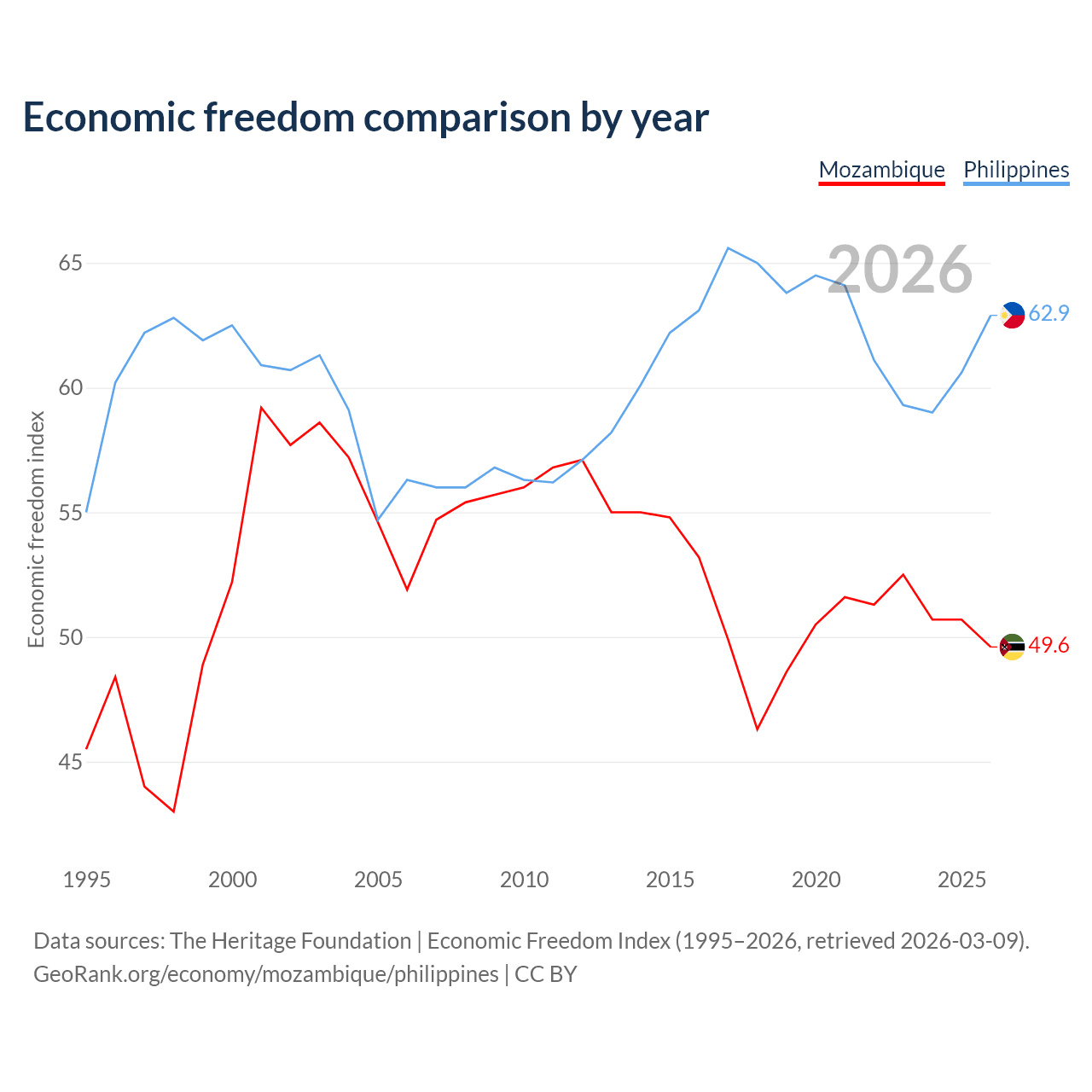 The Economic Freedom Index for Mozambique is 49.6, ranking 164/197, compared to 62.9 for the Philippines, ranking 85/197. The chart above displays a comparison of annual changes in economic freedom indexes.