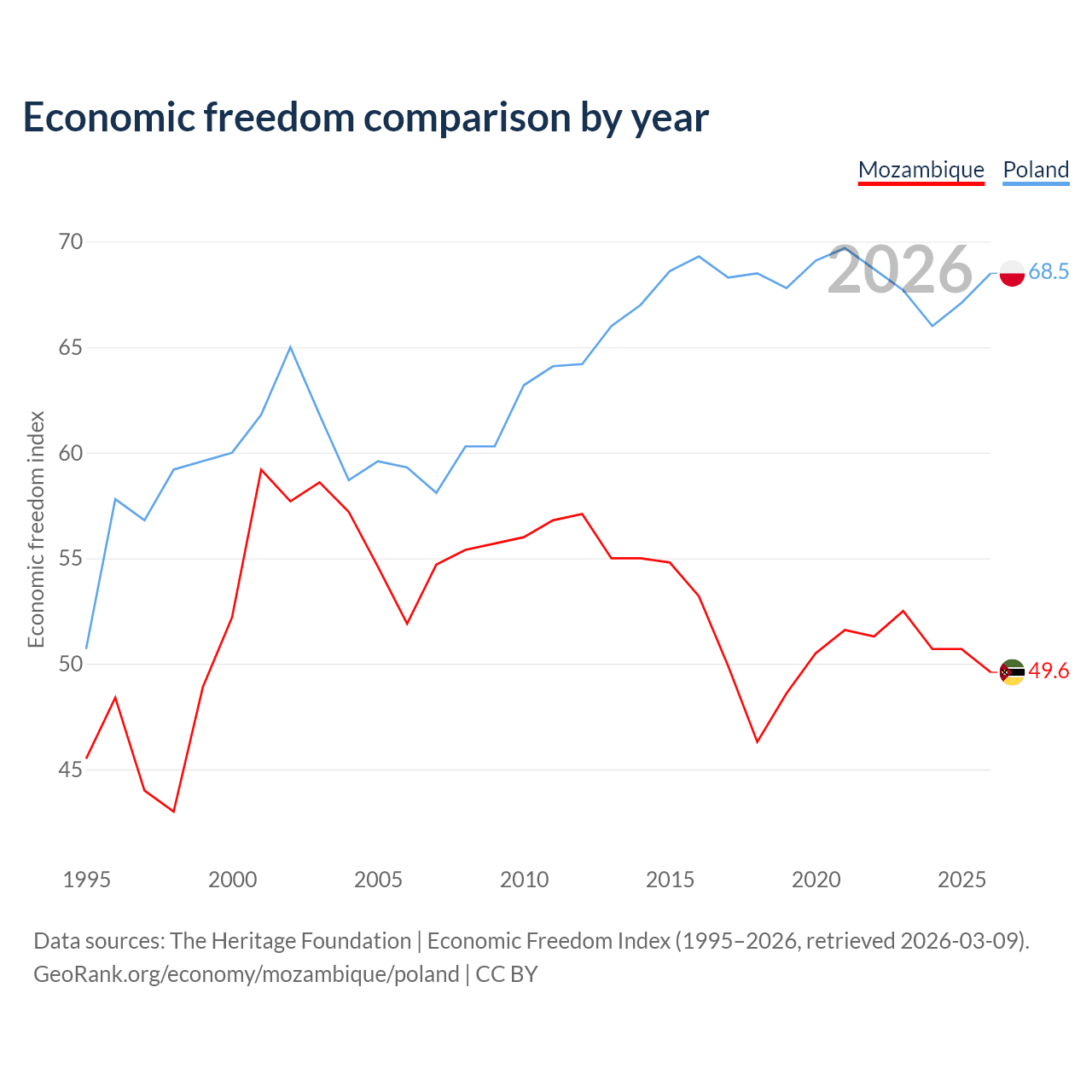 The Economic Freedom Index for Mozambique is 49.6, ranking 164/197, compared to 68.5 for Poland, ranking 46/197. The chart above displays a comparison of annual changes in economic freedom indexes.
