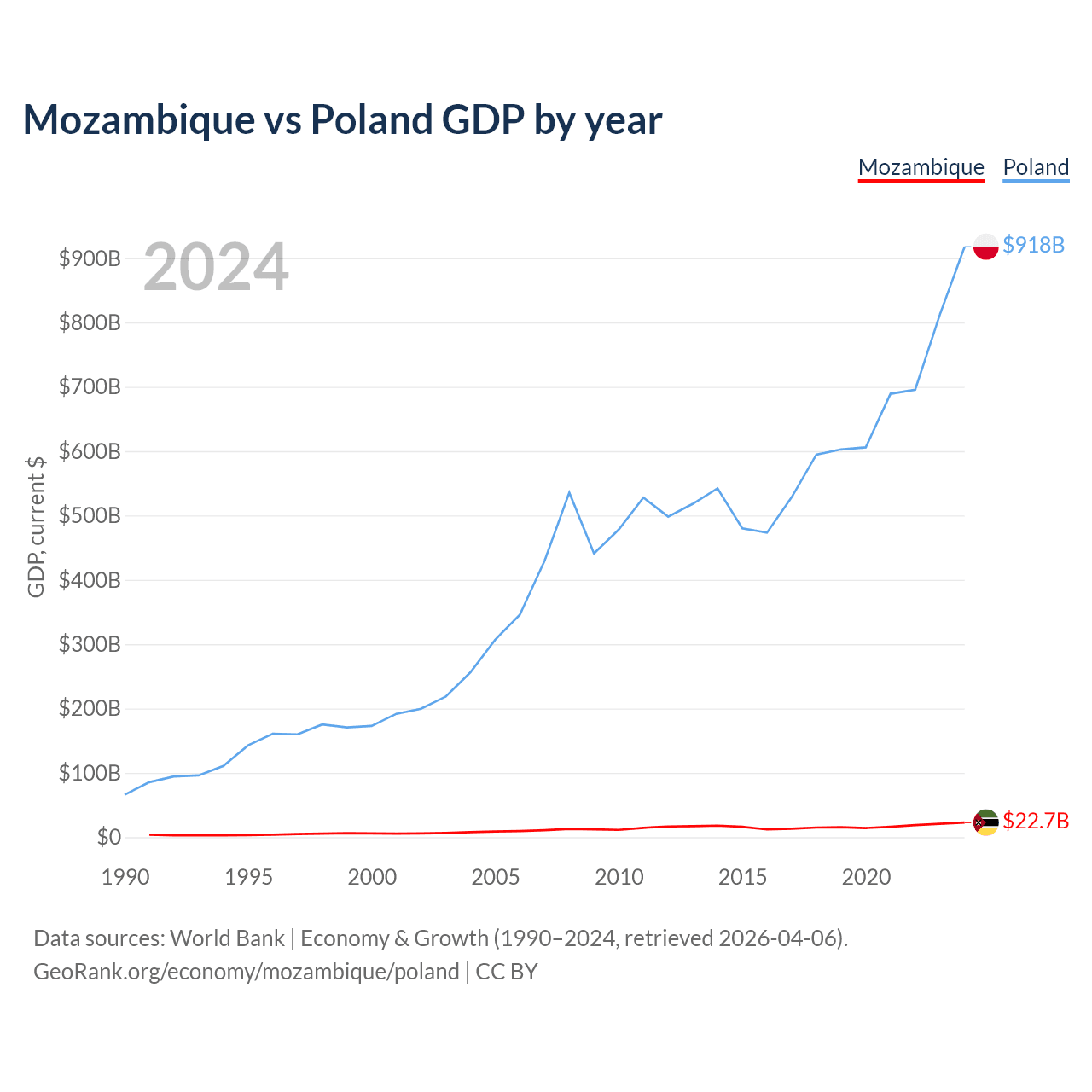 Mozambique has a GDP of $22.7B compared to $918B for Poland, ranking 123/197 and 21/197 by economy size, respectively.