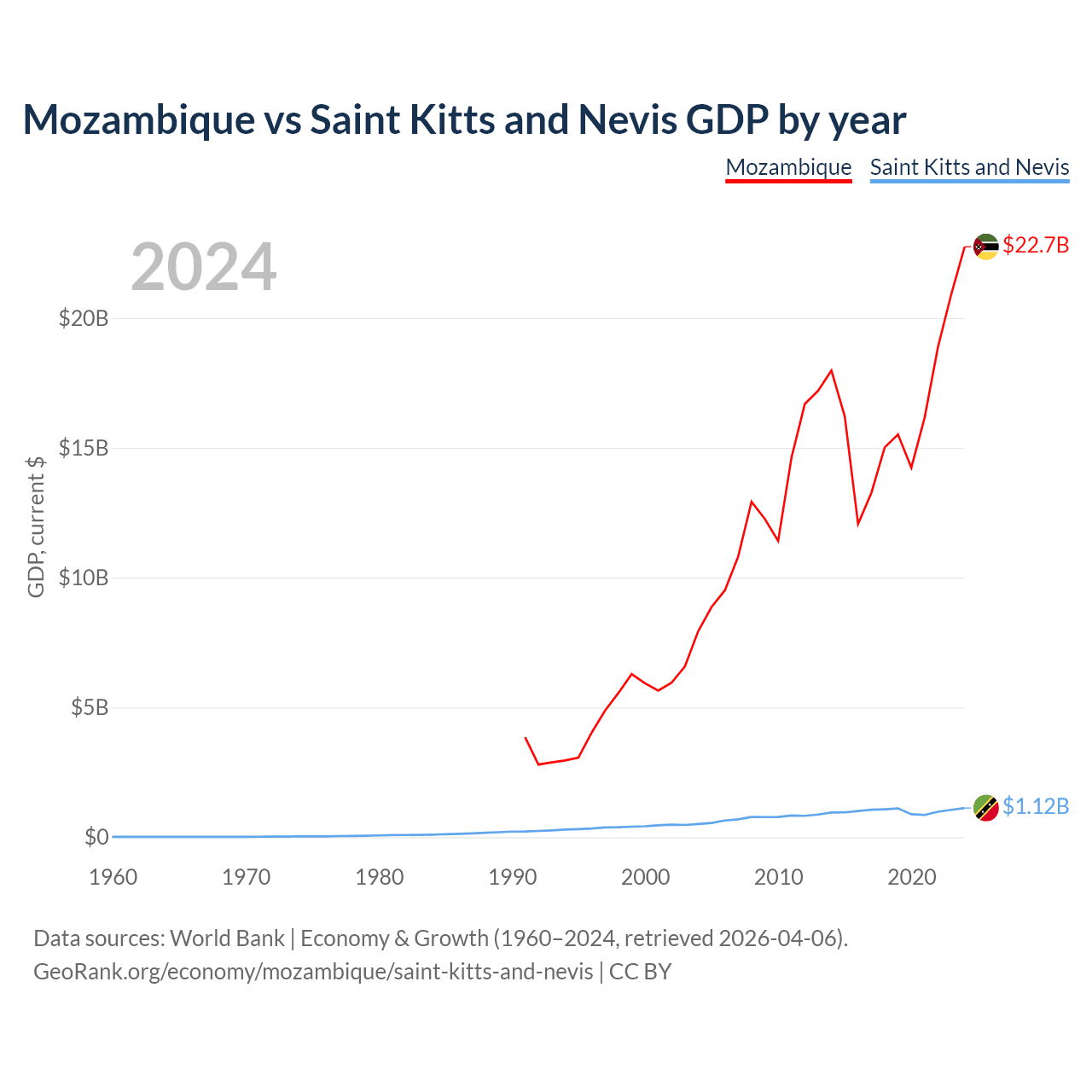 Mozambique has a GDP of $22.7B compared to $1.12B for Saint Kitts and Nevis, ranking 123/197 and 187/197 by economy size, respectively.