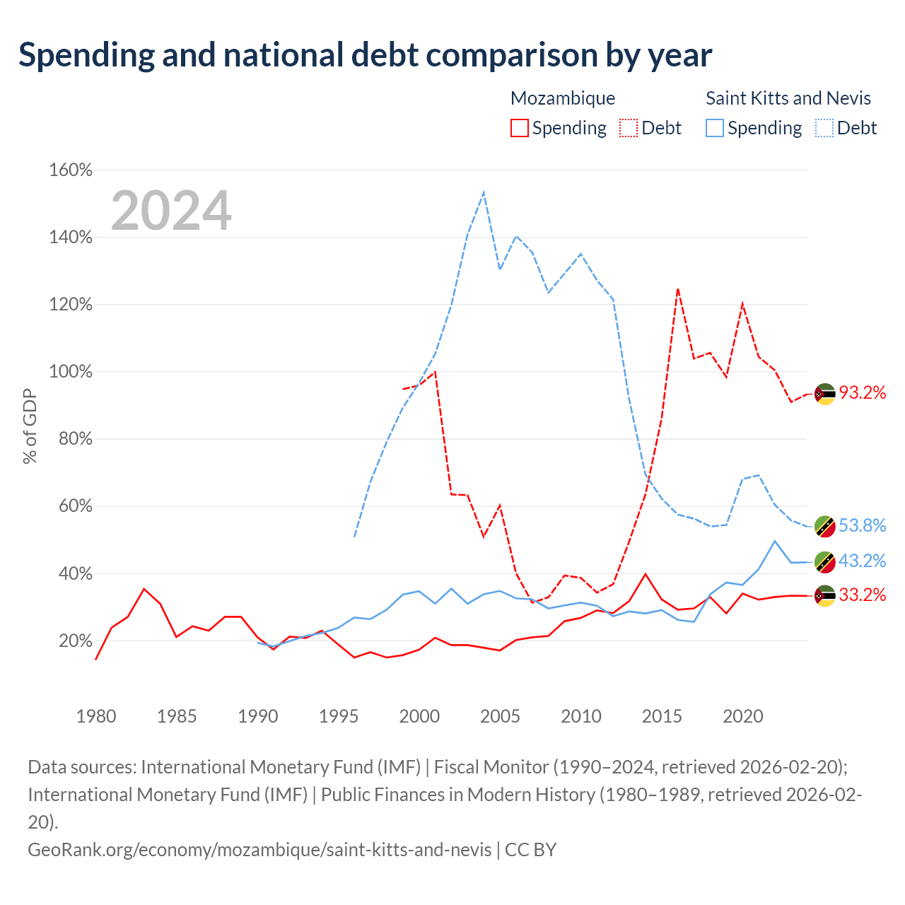 Mozambique has $21.2B in government debt (93.2% of GDP), compared to $604M (53.8% of GDP) in Saint Kitts and Nevis.