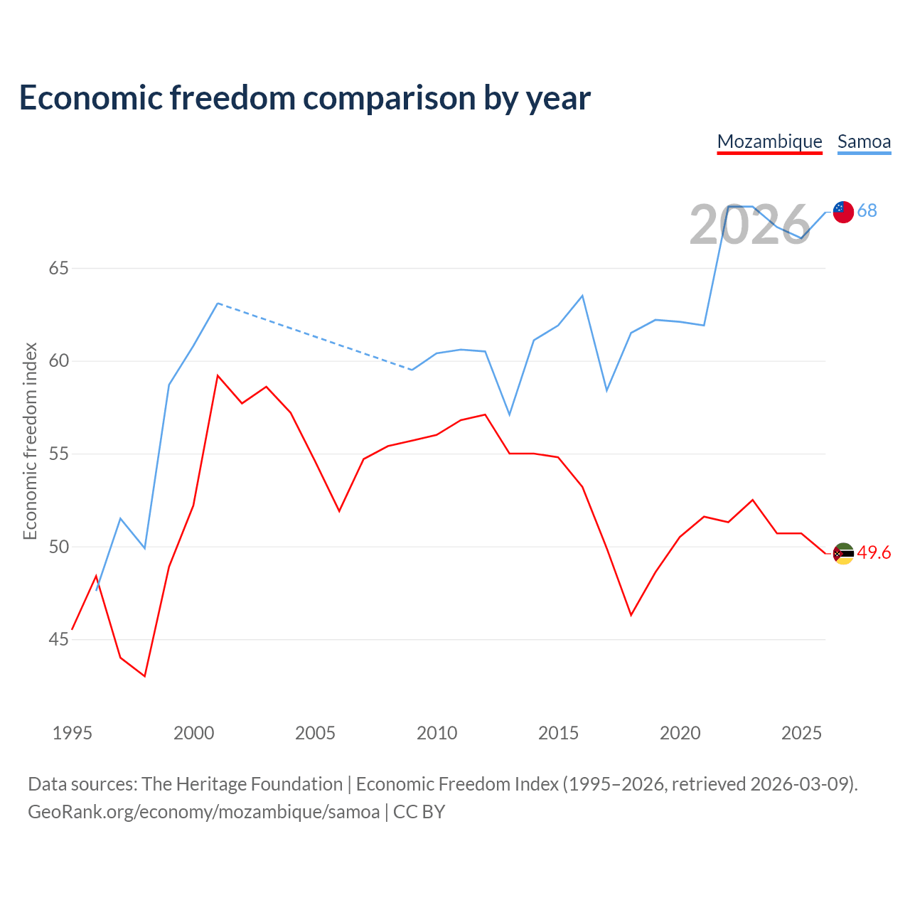The Economic Freedom Index for Mozambique is 49.6, ranking 164/197, compared to 68 for Samoa, ranking 52/197. The chart above displays a comparison of annual changes in economic freedom indexes.