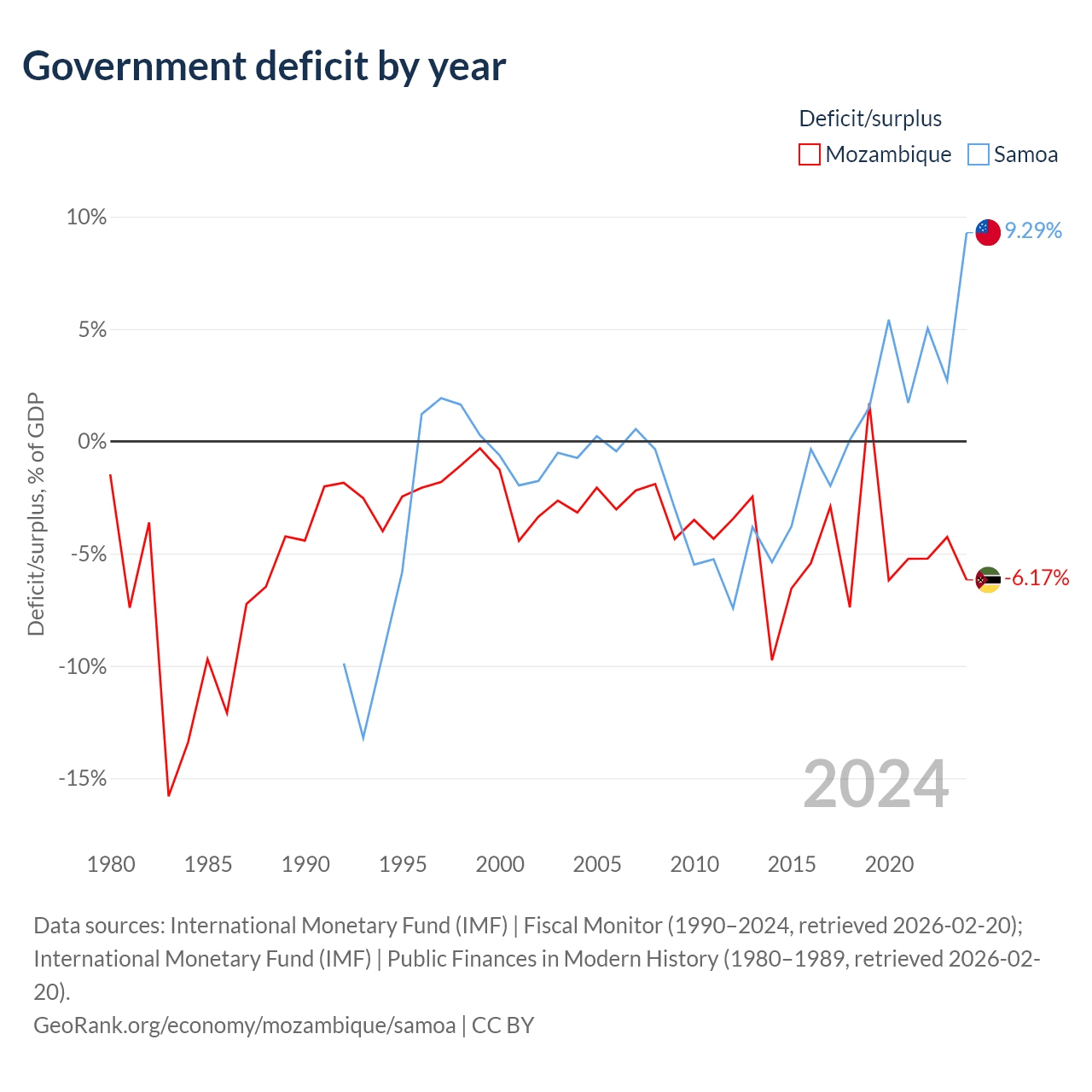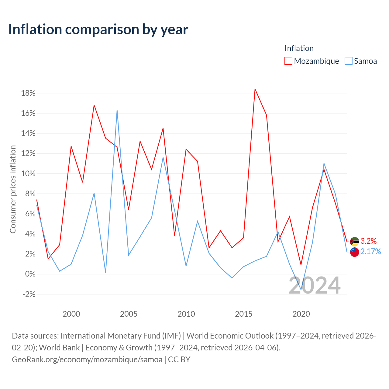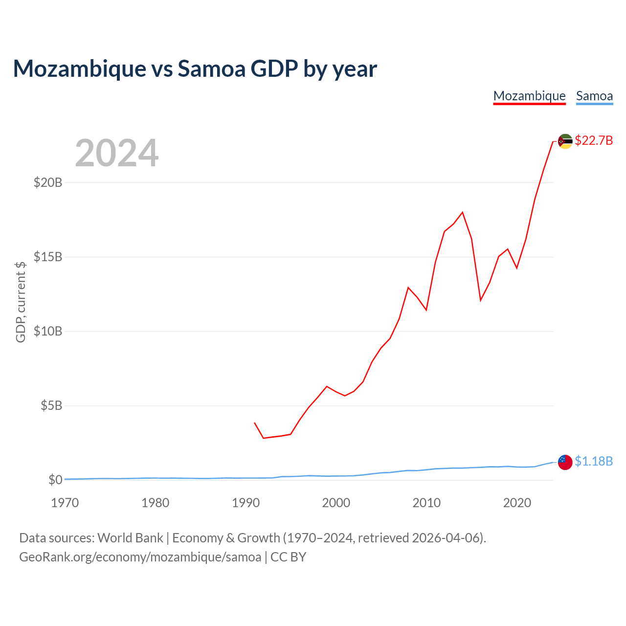 Mozambique has a GDP of $22.7B compared to $1.18B for Samoa, ranking 123/197 and 185/197 by economy size, respectively.