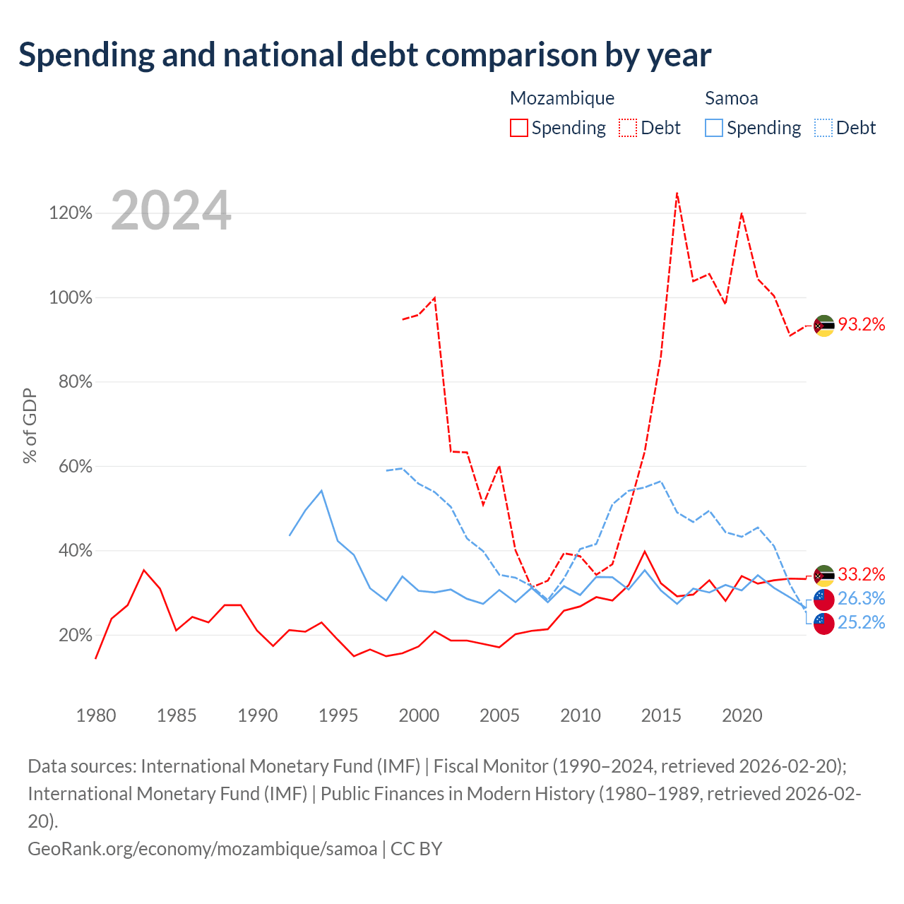 Mozambique has $21.2B in government debt (93.2% of GDP), compared to $296M (25.2% of GDP) in Samoa.