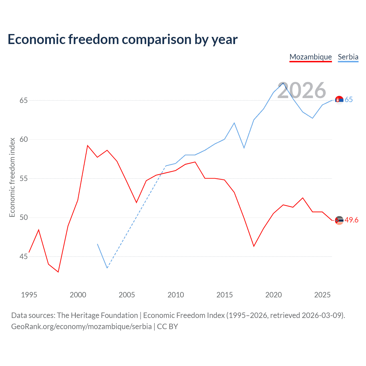 The Economic Freedom Index for Mozambique is 49.6, ranking 164/197, compared to 65 for Serbia, ranking 68/197. The chart above displays a comparison of annual changes in economic freedom indexes.