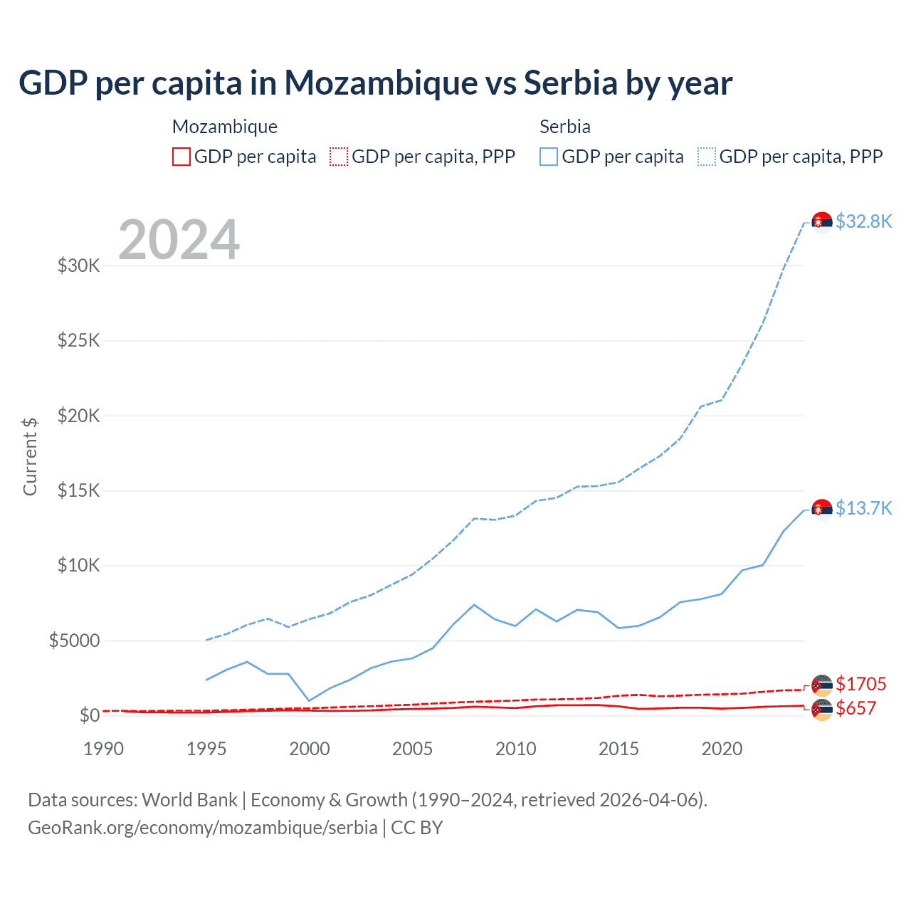 GDP per capita in Mozambique vs Serbia by year
