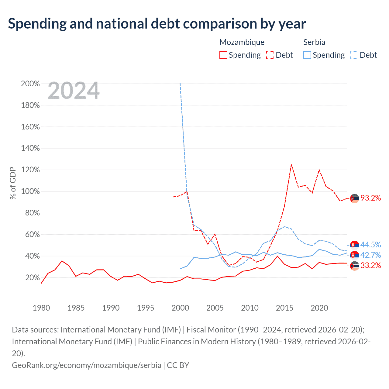 Mozambique has $21.2B in government debt (93.2% of GDP), compared to $40.1B (44.5% of GDP) in Serbia.