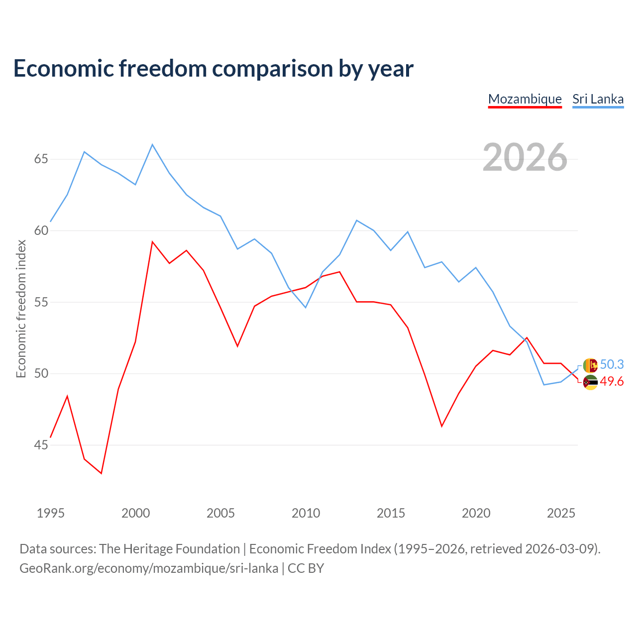 The Economic Freedom Index for Mozambique is 49.6, ranking 164/197, compared to 50.3 for Sri Lanka, ranking 162/197. The chart above displays a comparison of annual changes in economic freedom indexes.