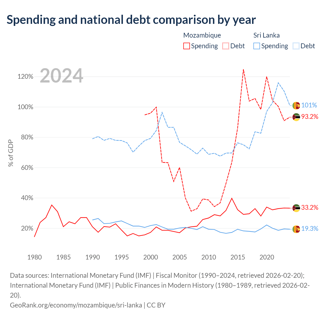 Mozambique has $21.2B in government debt (93.2% of GDP), compared to $99.8B (100.8% of GDP) in Sri Lanka.