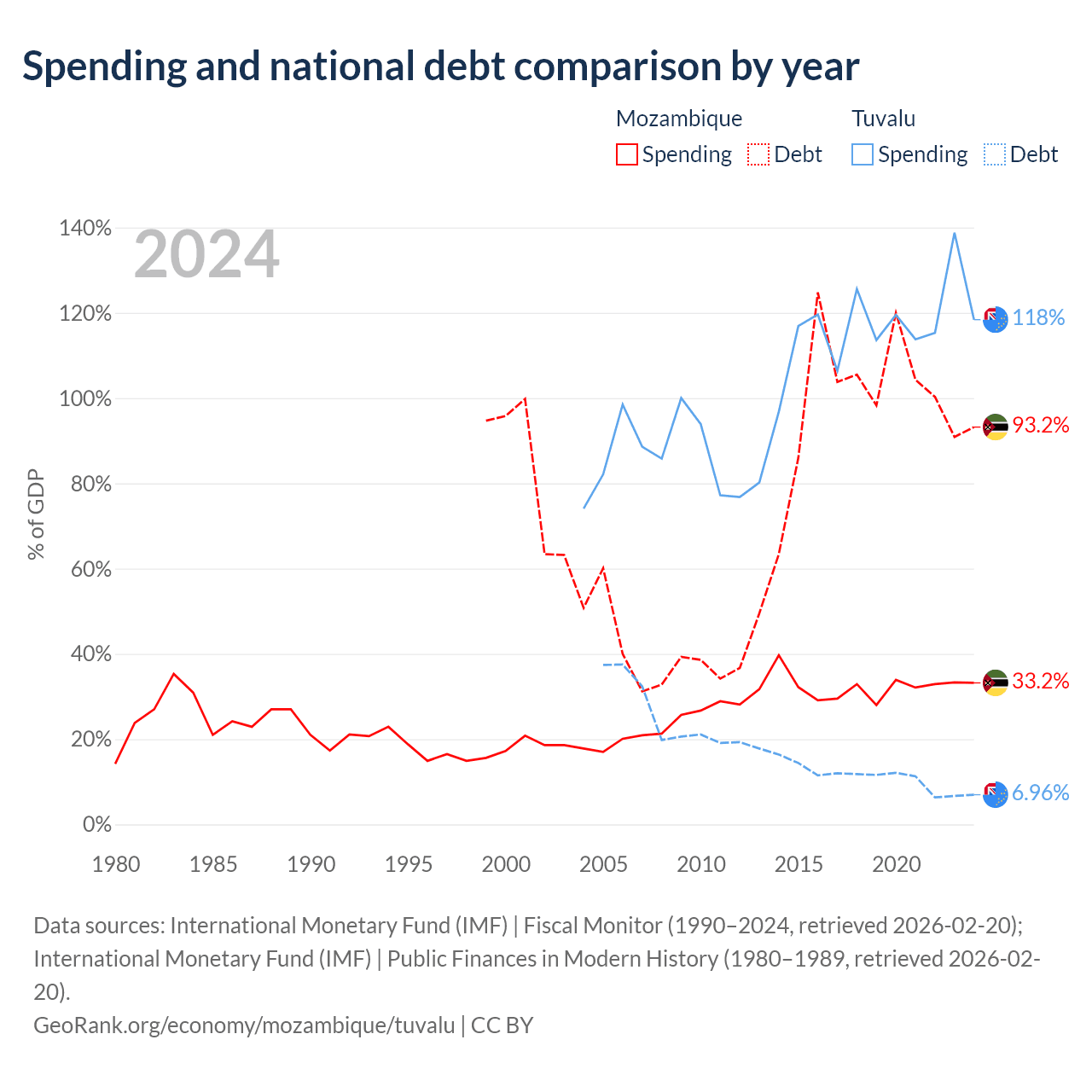 Mozambique has $21.2B in government debt (93.2% of GDP), compared to $4.15M (6.96% of GDP) in Tuvalu.