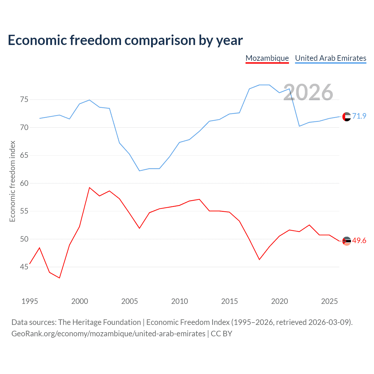 The Economic Freedom Index for Mozambique is 49.6, ranking 164/197, compared to 71.9 for the United Arab Emirates, ranking 29/197. The chart above displays a comparison of annual changes in economic freedom indexes.
