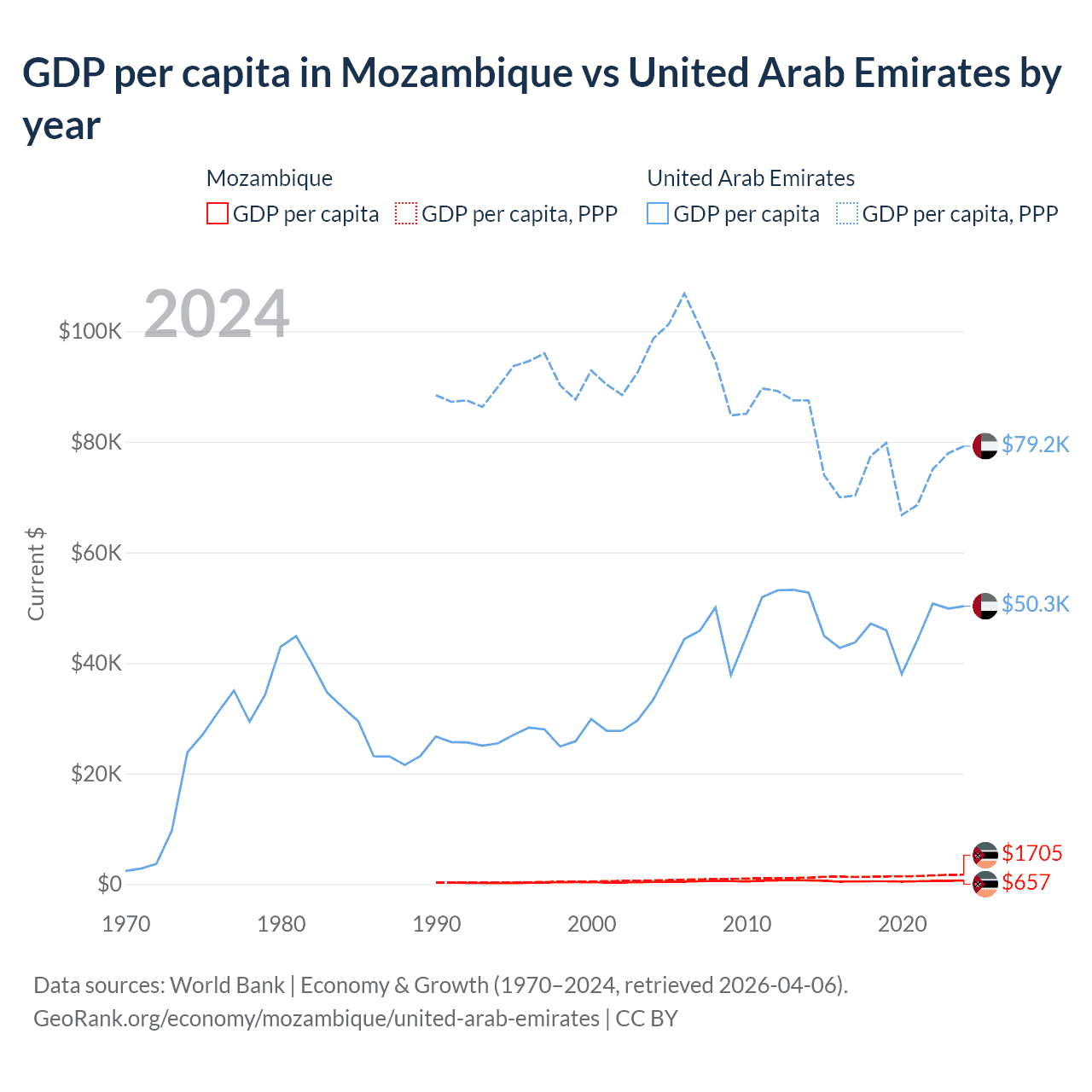 GDP per capita in Mozambique vs United Arab Emirates by year