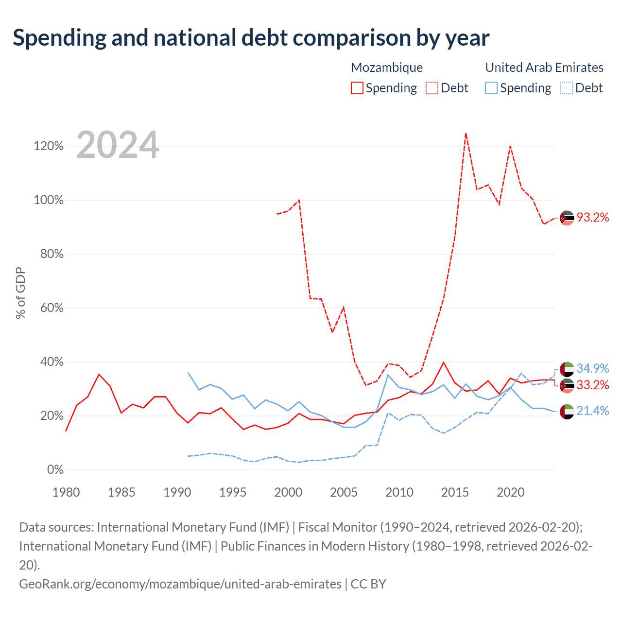 Mozambique has $21.2B in government debt (93.2% of GDP), compared to $193B (34.9% of GDP) in the United Arab Emirates.