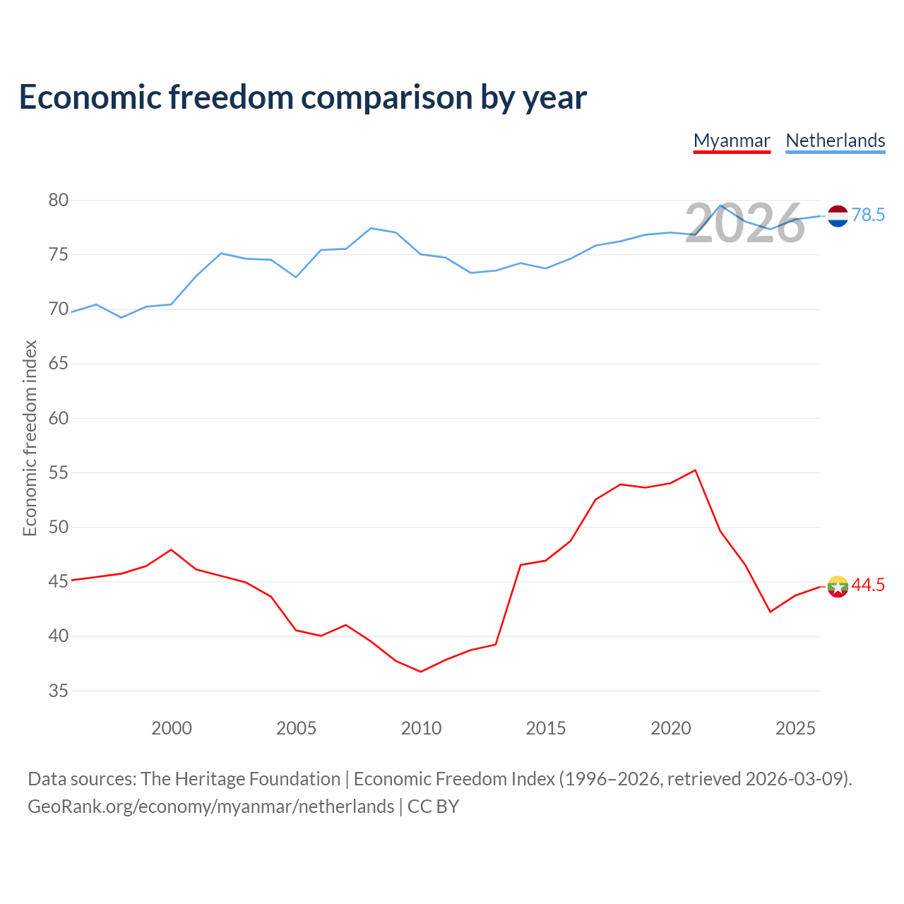 The Economic Freedom Index for Myanmar is 44.5, ranking 180/197, compared to 78.5 for the Netherlands, ranking 11/197. The chart above displays a comparison of annual changes in economic freedom indexes.