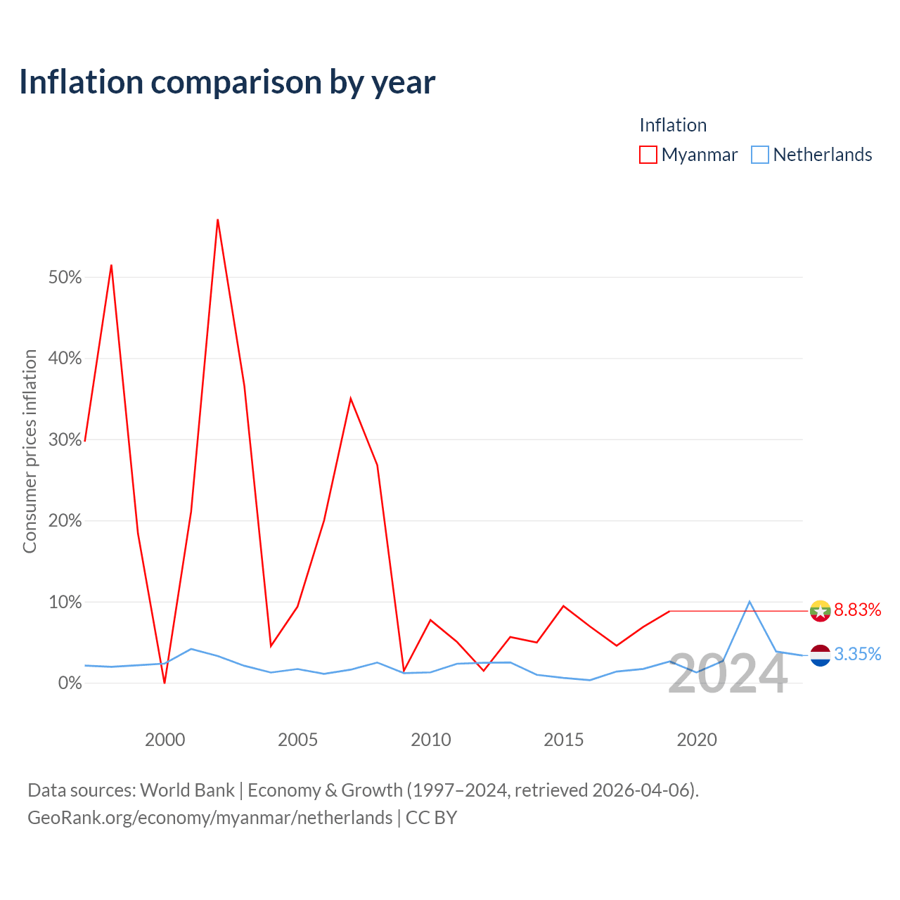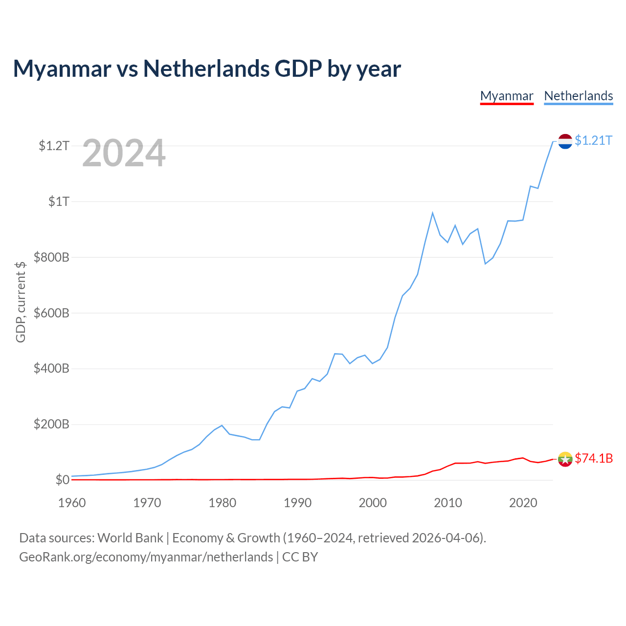 Myanmar has a GDP of $74.1B compared to $1.21T for the Netherlands, ranking 85/197 and 19/197 by economy size, respectively.