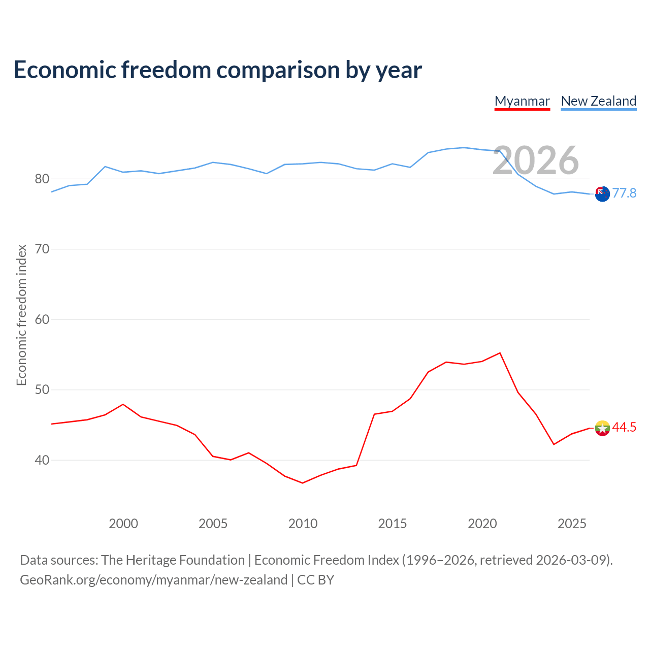 The Economic Freedom Index for Myanmar is 44.5, ranking 180/197, compared to 77.8 for New Zealand, ranking 13/197. The chart above displays a comparison of annual changes in economic freedom indexes.