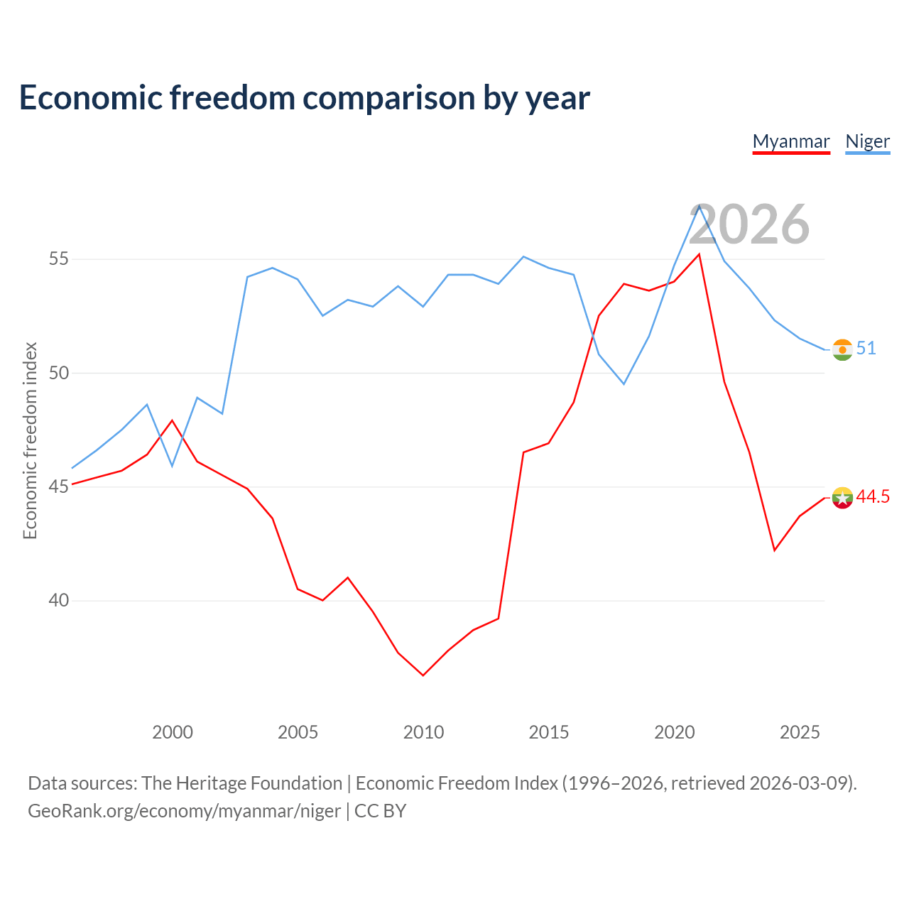 The Economic Freedom Index for Myanmar is 44.5, ranking 180/197, compared to 51 for Niger, ranking 156/197. The chart above displays a comparison of annual changes in economic freedom indexes.