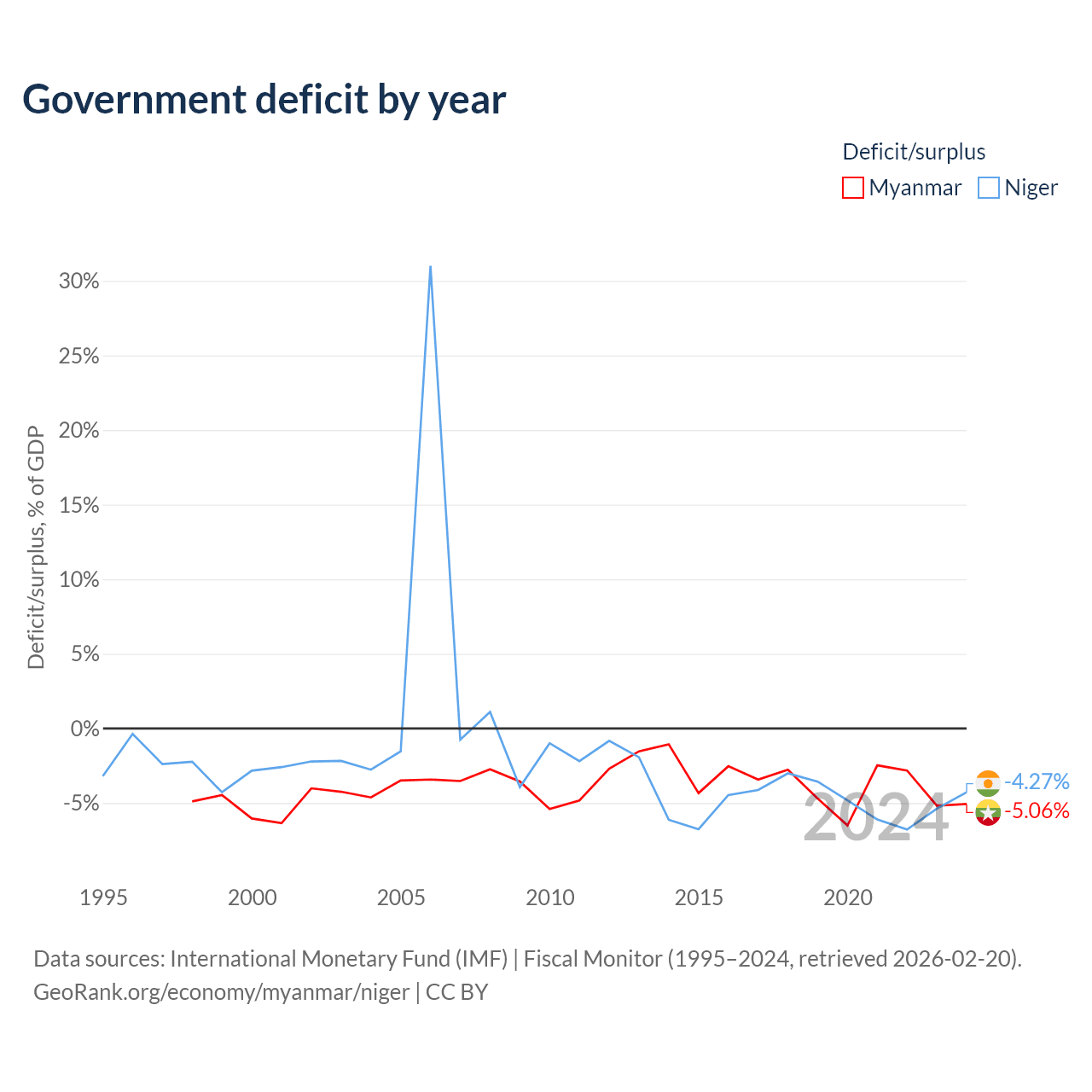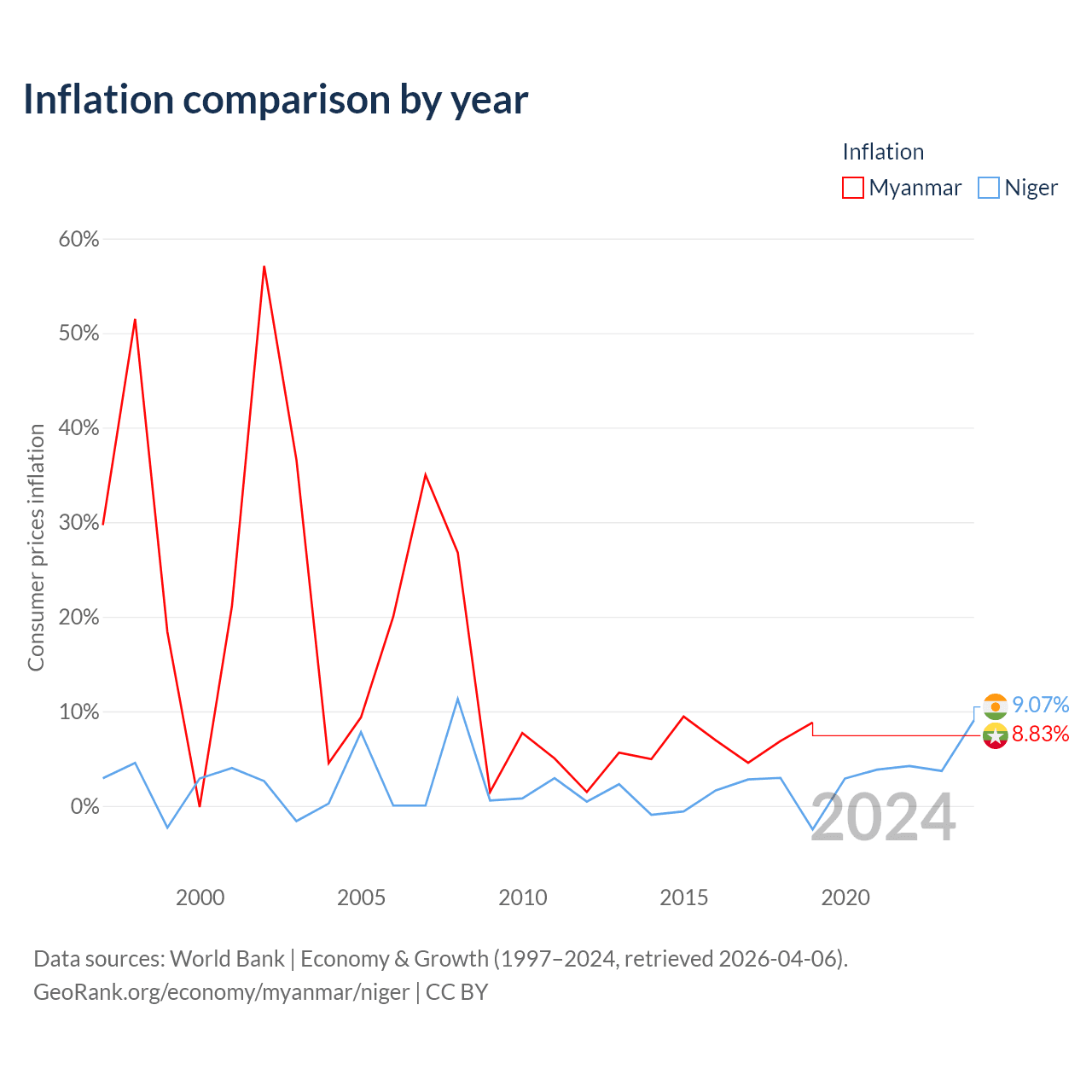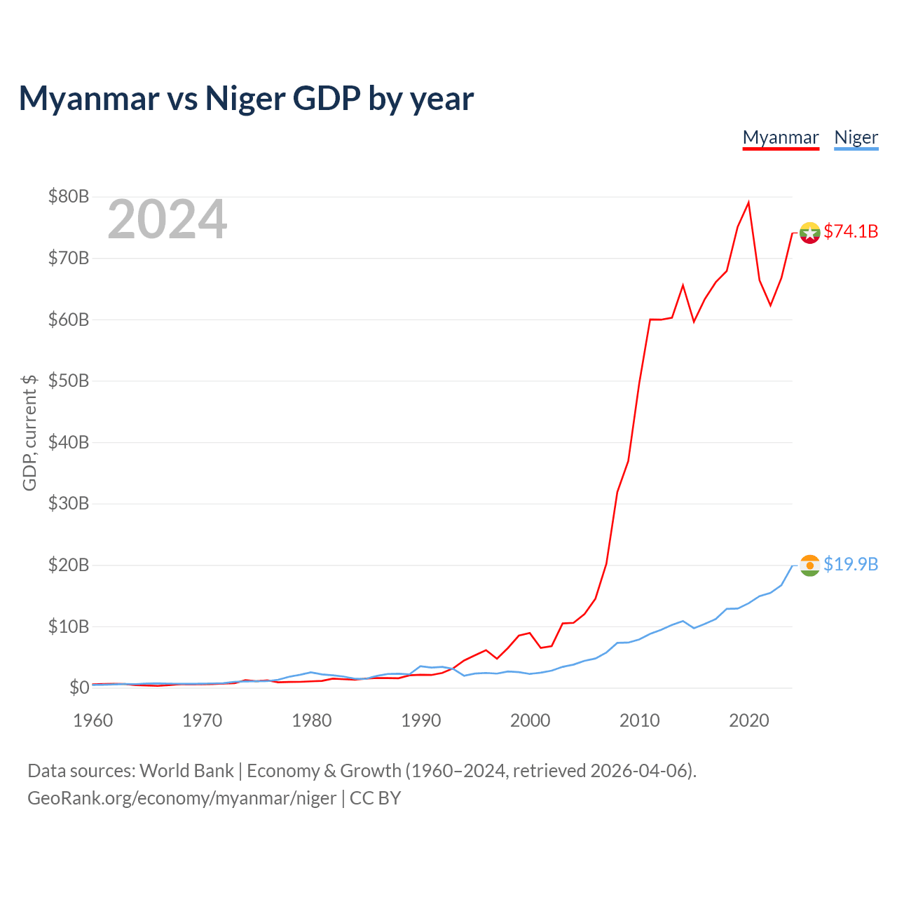 Myanmar has a GDP of $74.1B compared to $19.9B for Niger, ranking 85/197 and 130/197 by economy size, respectively.