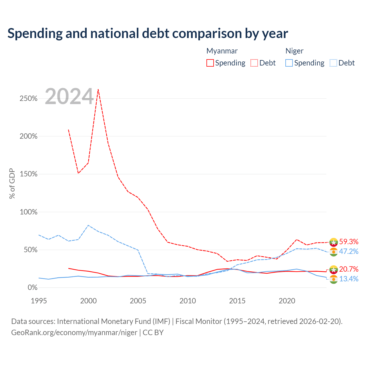 Myanmar has $44B in government debt (59.3% of GDP), compared to $9.39B (47.2% of GDP) in Niger.