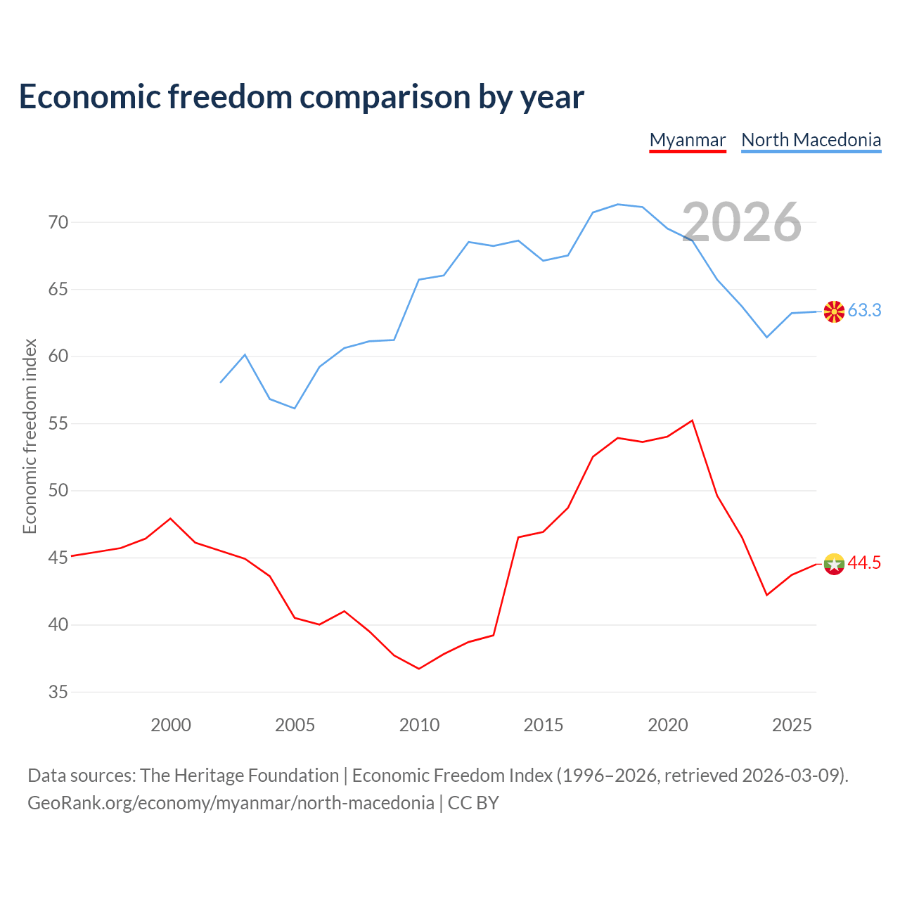 Data sources: The Heritage Foundation | Economic Freedom Index (1996–2026, retrieved 2026-03-09).