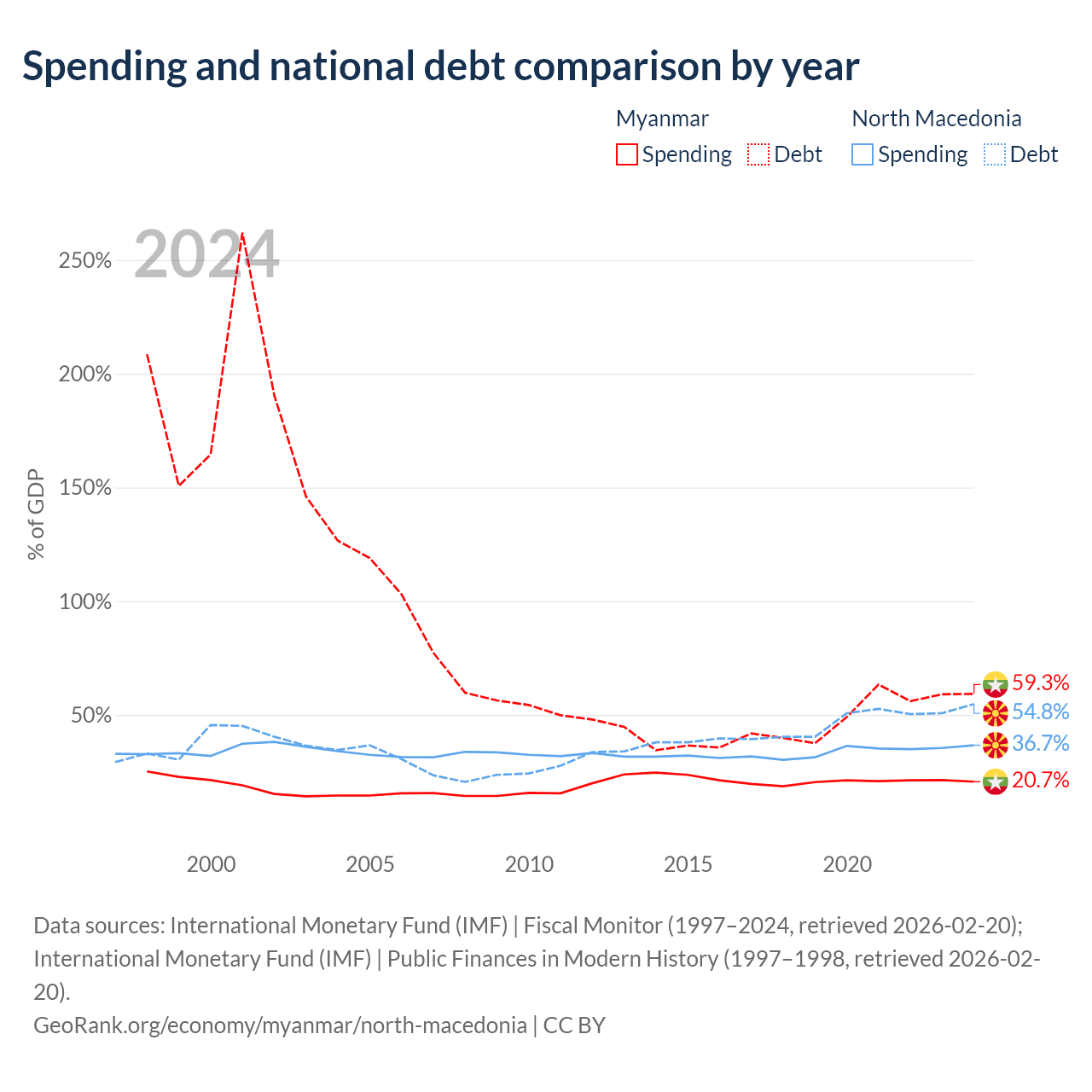 Myanmar has $44B in government debt (59.3% of GDP), compared to $9.3B (54.8% of GDP) in North Macedonia.