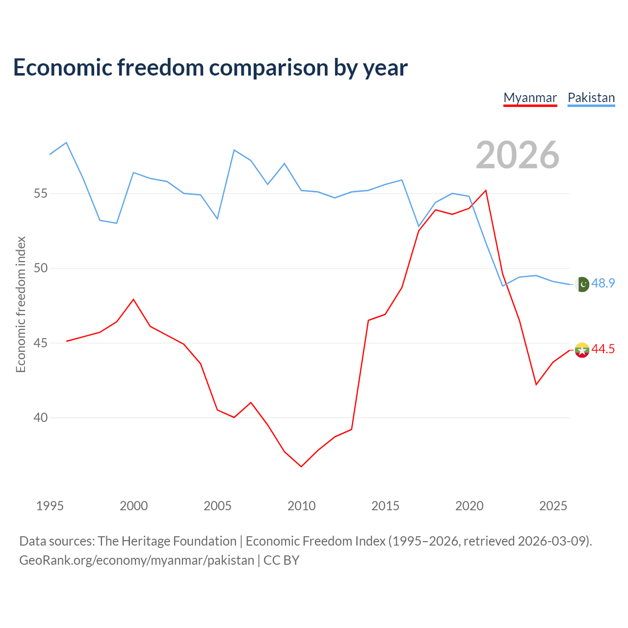 The Economic Freedom Index for Myanmar is 44.5, ranking 180/197, compared to 48.9 for Pakistan, ranking 168/197. The chart above displays a comparison of annual changes in economic freedom indexes.