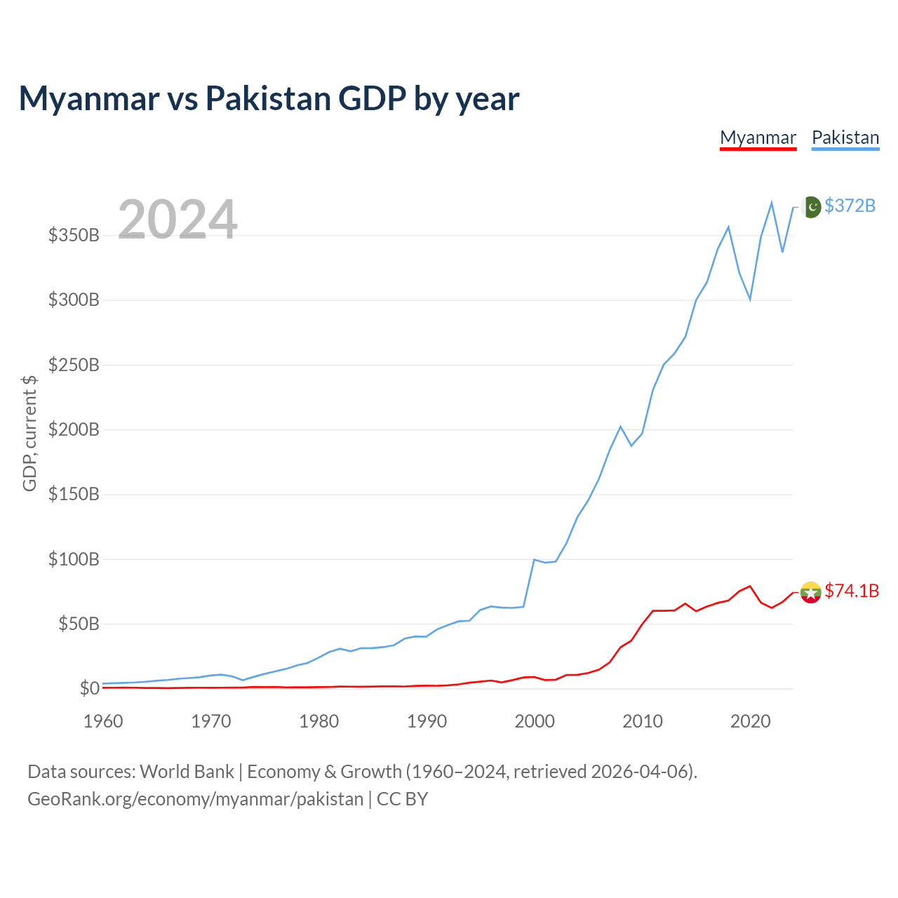 Myanmar has a GDP of $74.1B compared to $372B for Pakistan, ranking 85/197 and 43/197 by economy size, respectively.