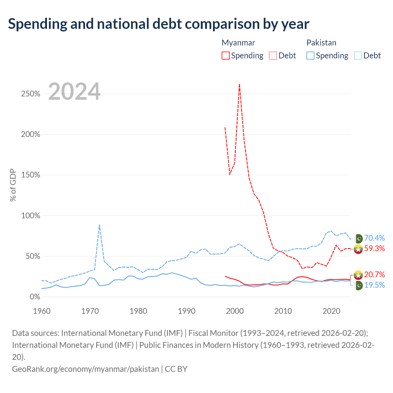 Myanmar has $44B in government debt (59.3% of GDP), compared to $262B (70.4% of GDP) in Pakistan.