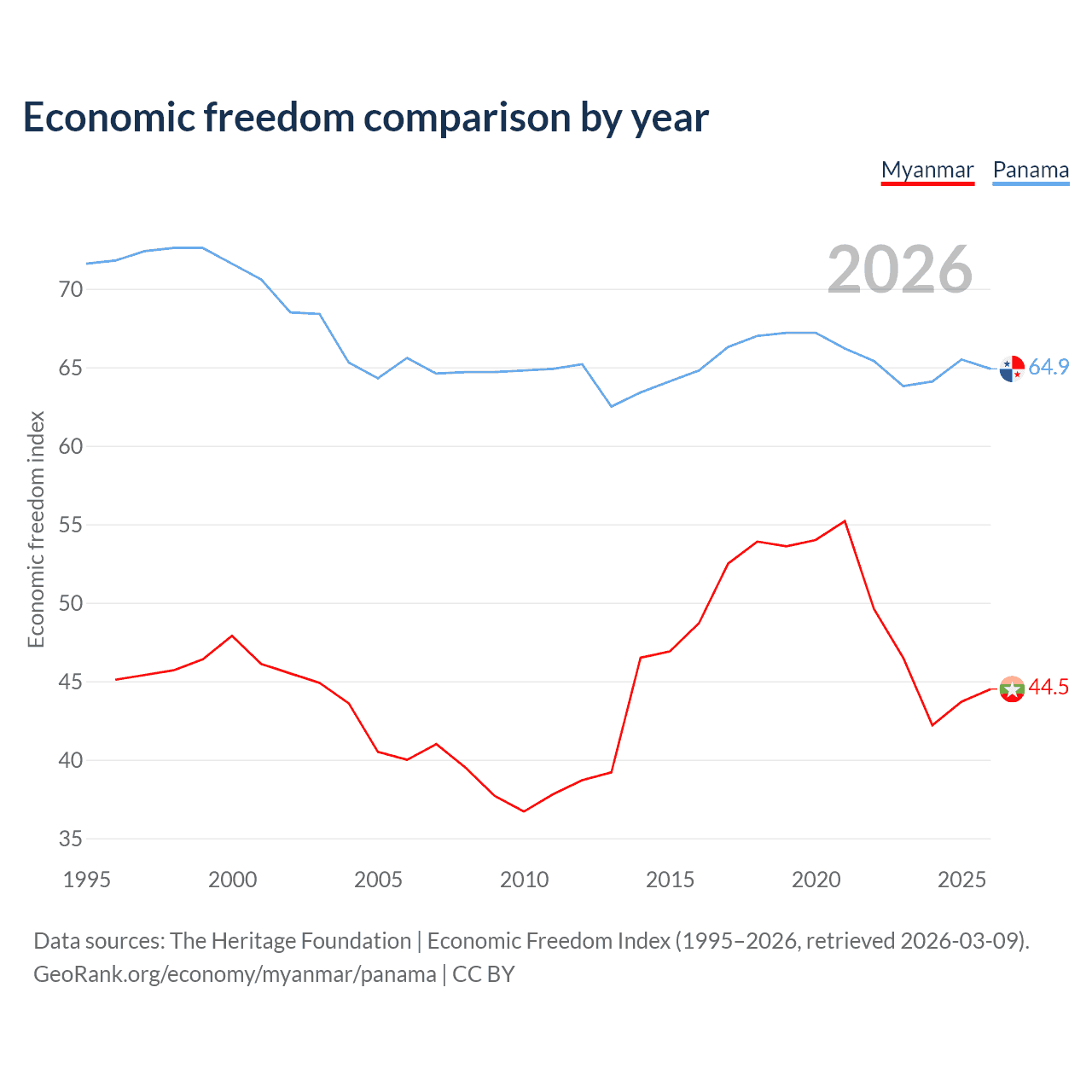 The Economic Freedom Index for Myanmar is 44.5, ranking 180/197, compared to 64.9 for Panama, ranking 70/197. The chart above displays a comparison of annual changes in economic freedom indexes.