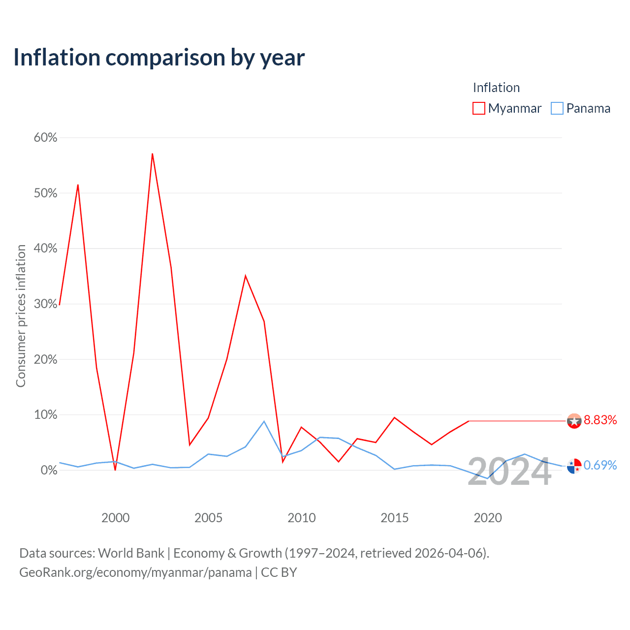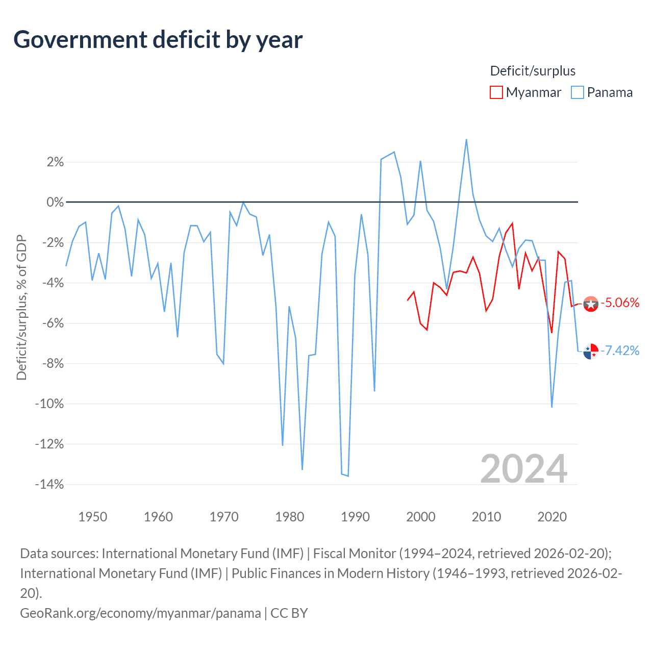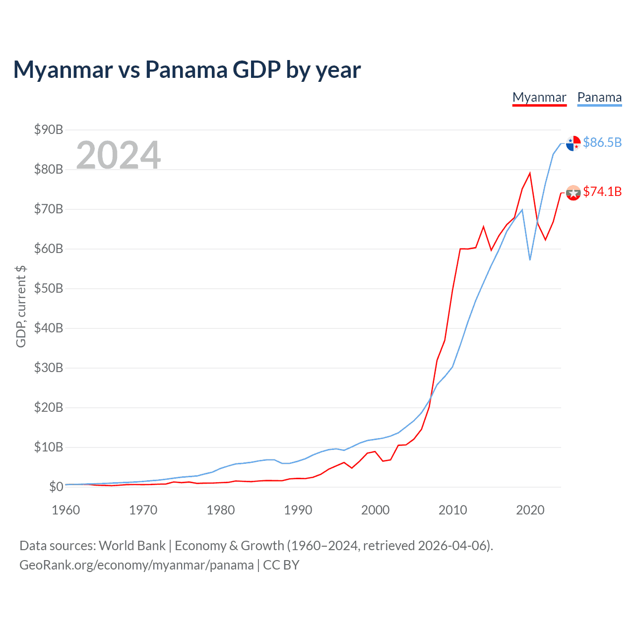 Myanmar has a GDP of $74.1B compared to $86.5B for Panama, ranking 85/197 and 78/197 by economy size, respectively.