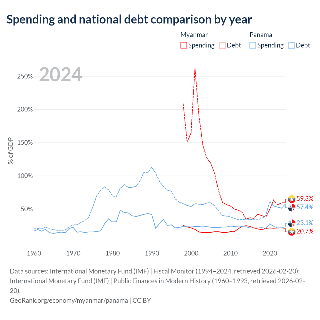 Myanmar has $44B in government debt (59.3% of GDP), compared to $49.6B (57.4% of GDP) in Panama.