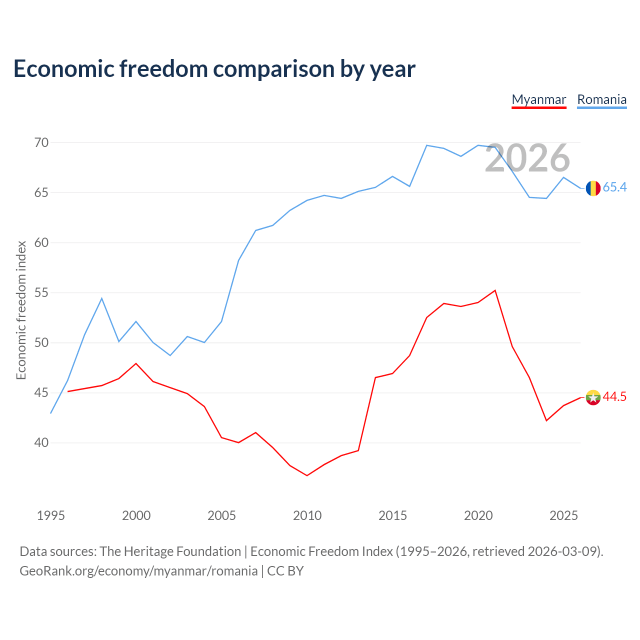 The Economic Freedom Index for Myanmar is 44.5, ranking 180/197, compared to 65.4 for Romania, ranking 64/197. The chart above displays a comparison of annual changes in economic freedom indexes.