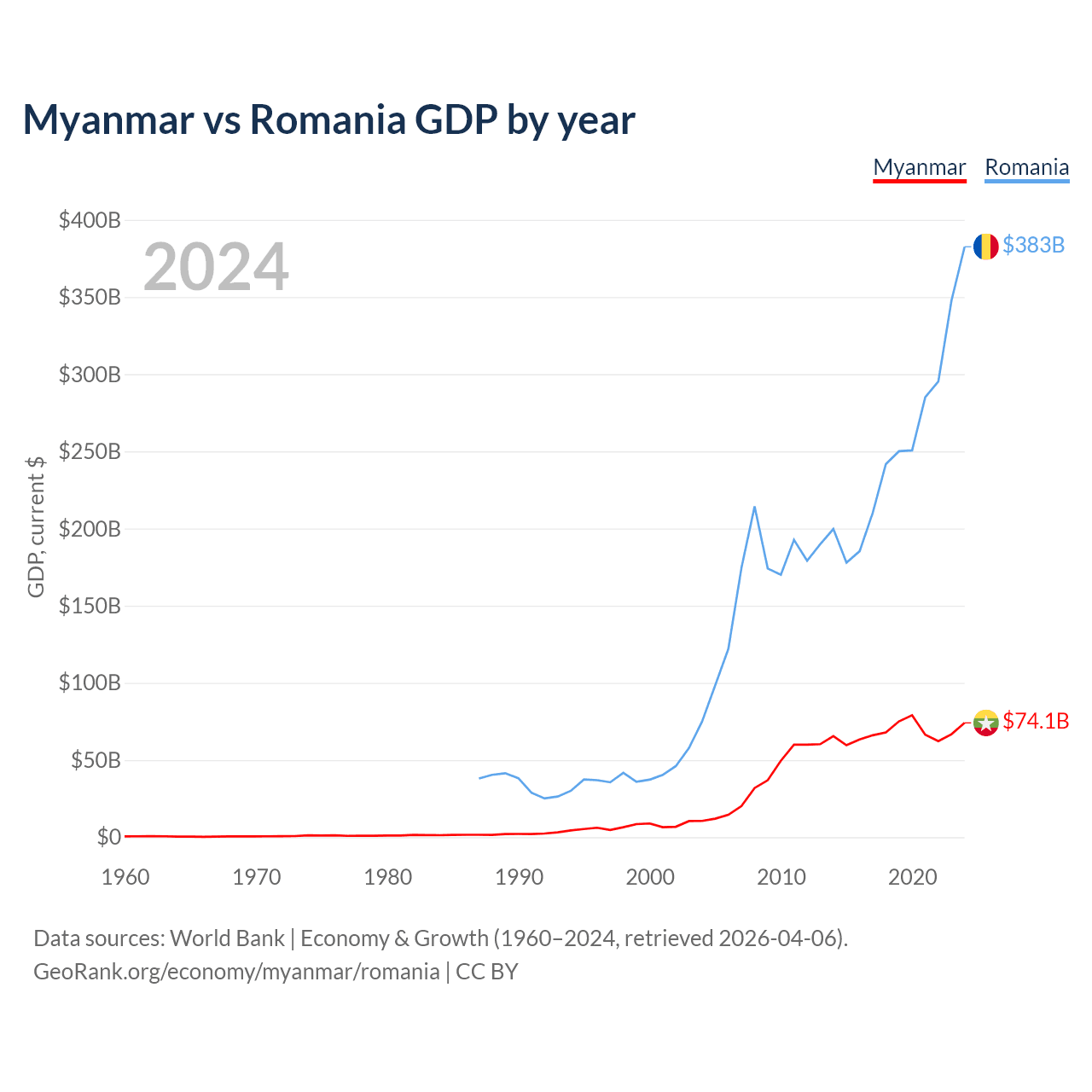 Myanmar has a GDP of $74.1B compared to $383B for Romania, ranking 85/197 and 42/197 by economy size, respectively.