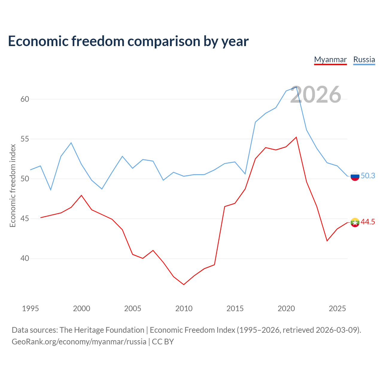 The Economic Freedom Index for Myanmar is 44.5, ranking 180/197, compared to 50.3 for Russia, ranking 161/197. The chart above displays a comparison of annual changes in economic freedom indexes.