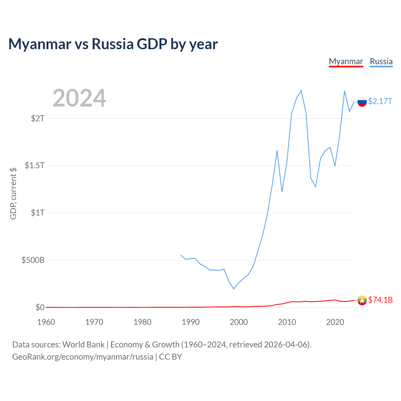 Myanmar has a GDP of $74.1B compared to $2.17T for Russia, ranking 85/197 and 11/197 by economy size, respectively.