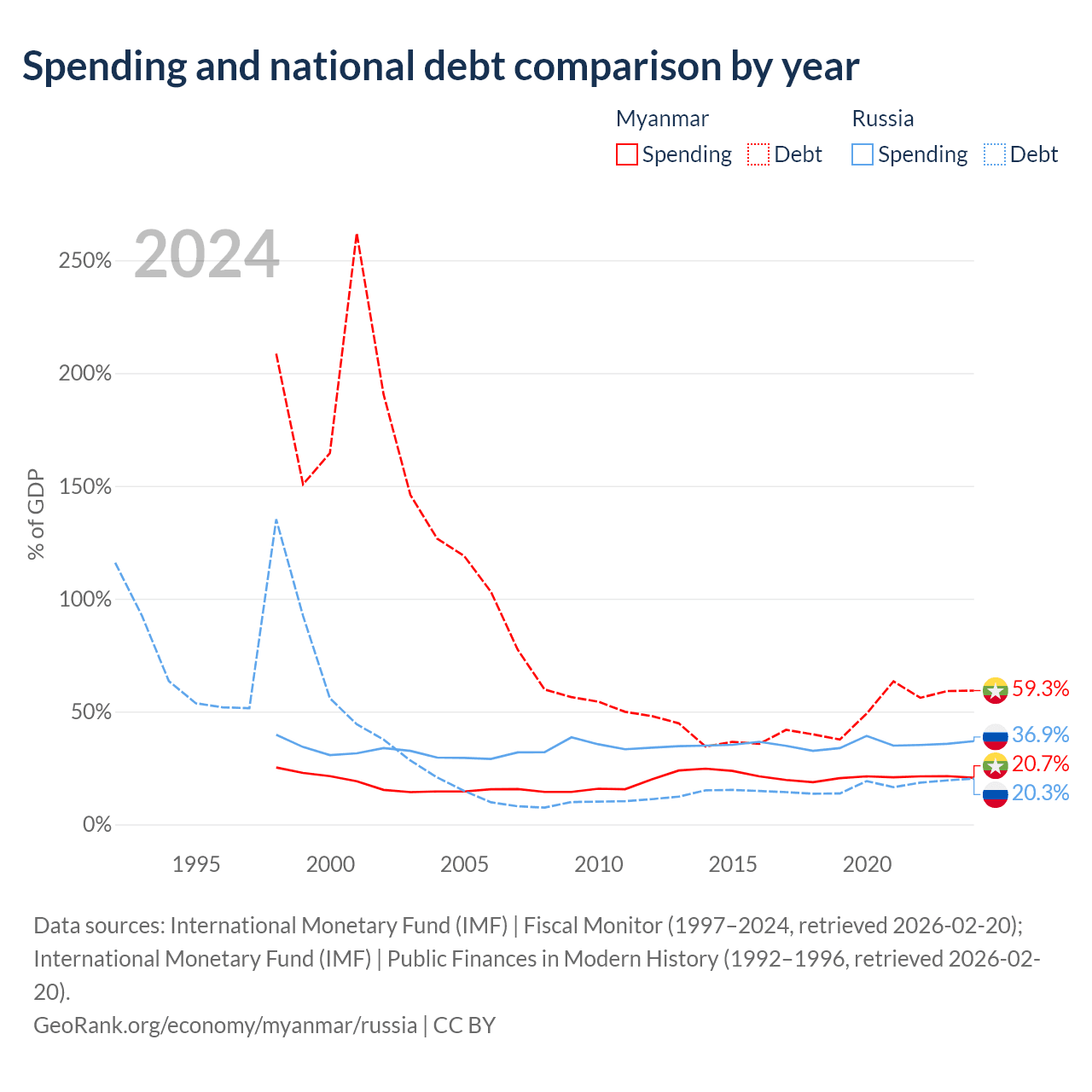 Myanmar has $44B in government debt (59.3% of GDP), compared to $440B (20.3% of GDP) in Russia.