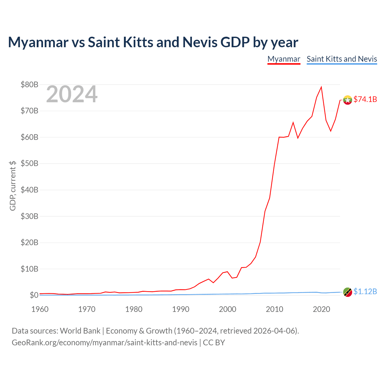 Myanmar has a GDP of $74.1B compared to $1.12B for Saint Kitts and Nevis, ranking 85/197 and 187/197 by economy size, respectively.