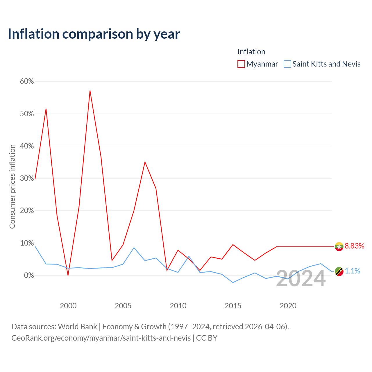Over the past 23 years, Myanmar has recorded an average annual inflation rate of 16.2%, compared with 2.42% in Saint Kitts and Nevis. In 2019, inflation was 8.83% in Myanmar and 1.1% in Saint Kitts and Nevis.