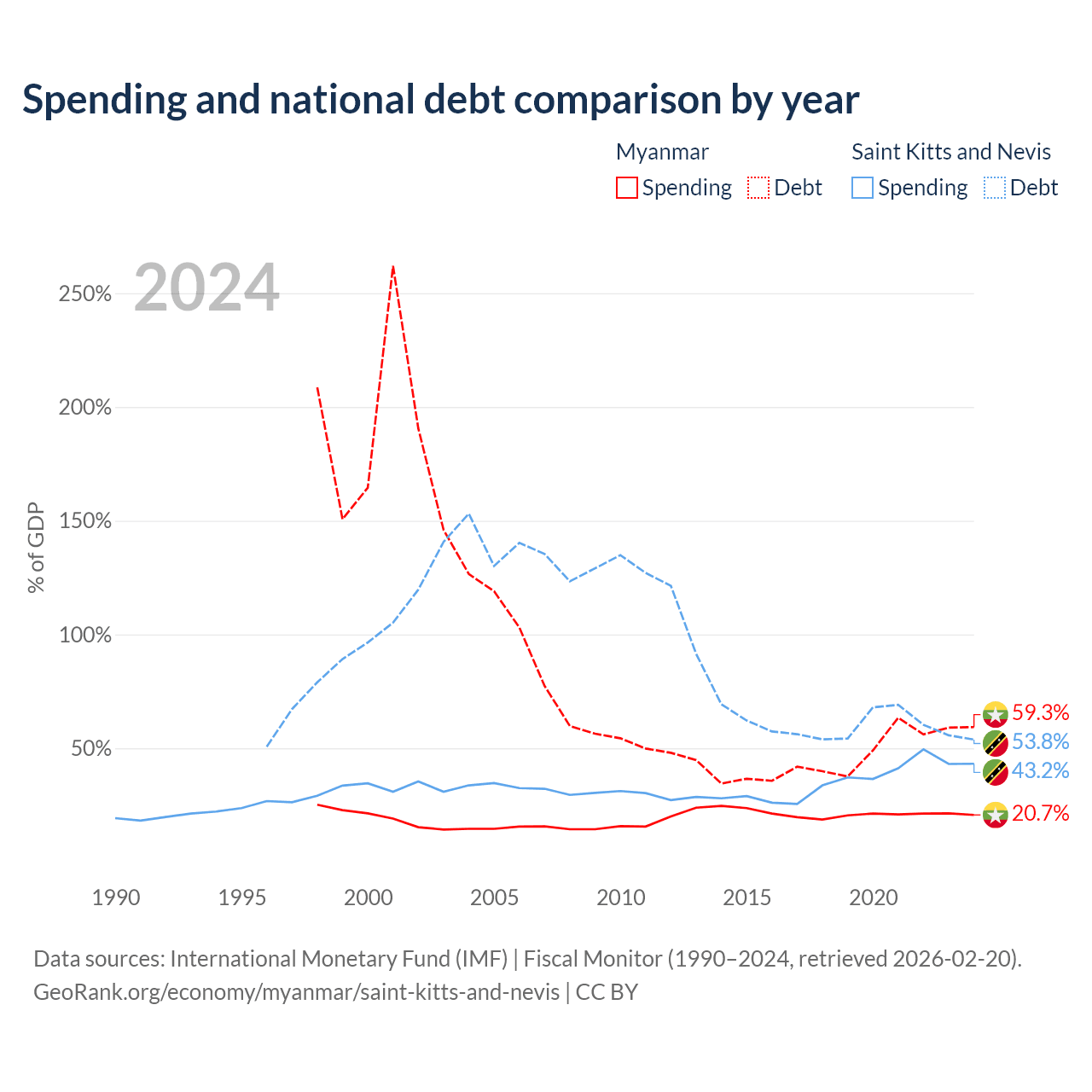 Myanmar has $44B in government debt (59.3% of GDP), compared to $604M (53.8% of GDP) in Saint Kitts and Nevis.