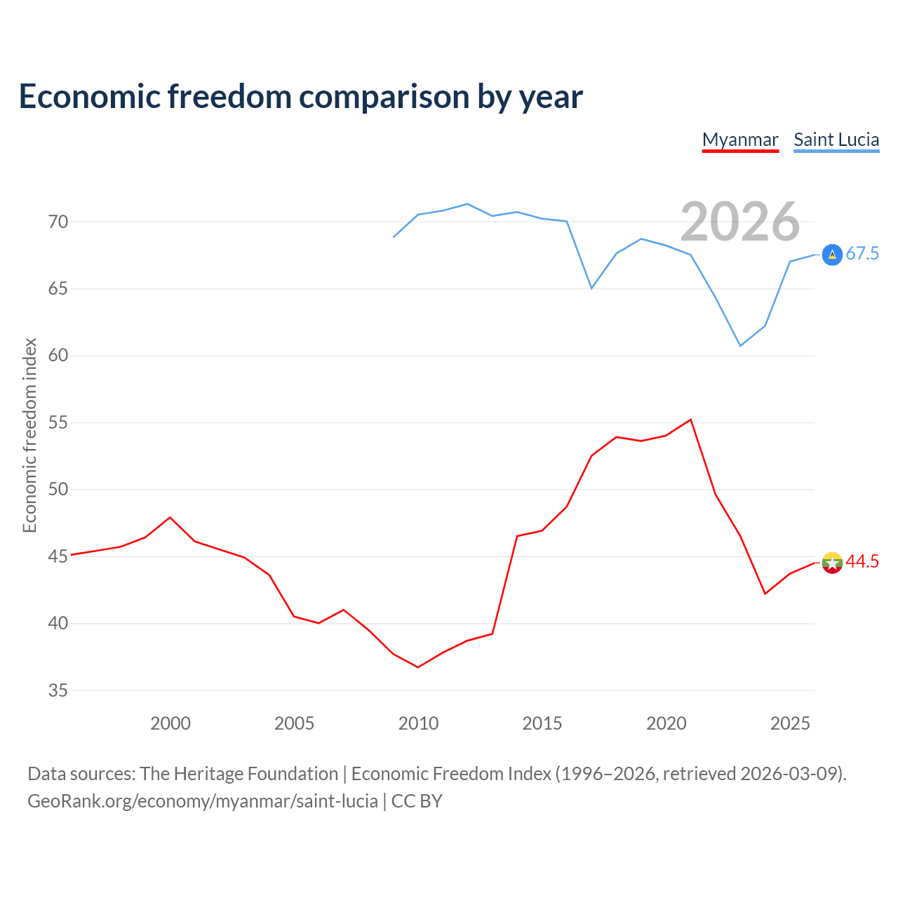 The Economic Freedom Index for Myanmar is 44.5, ranking 180/197, compared to 67.5 for Saint Lucia, ranking 57/197. The chart above displays a comparison of annual changes in economic freedom indexes.