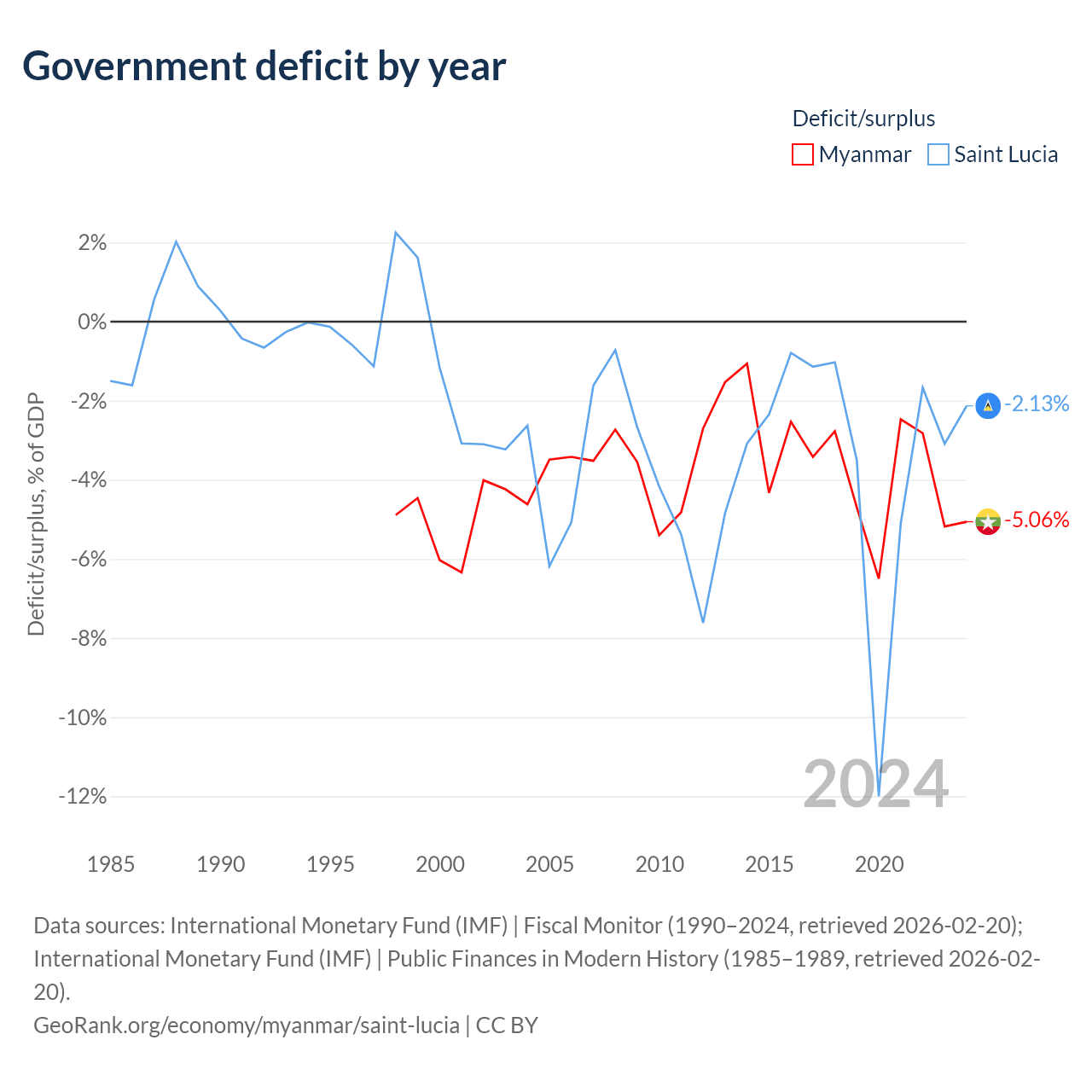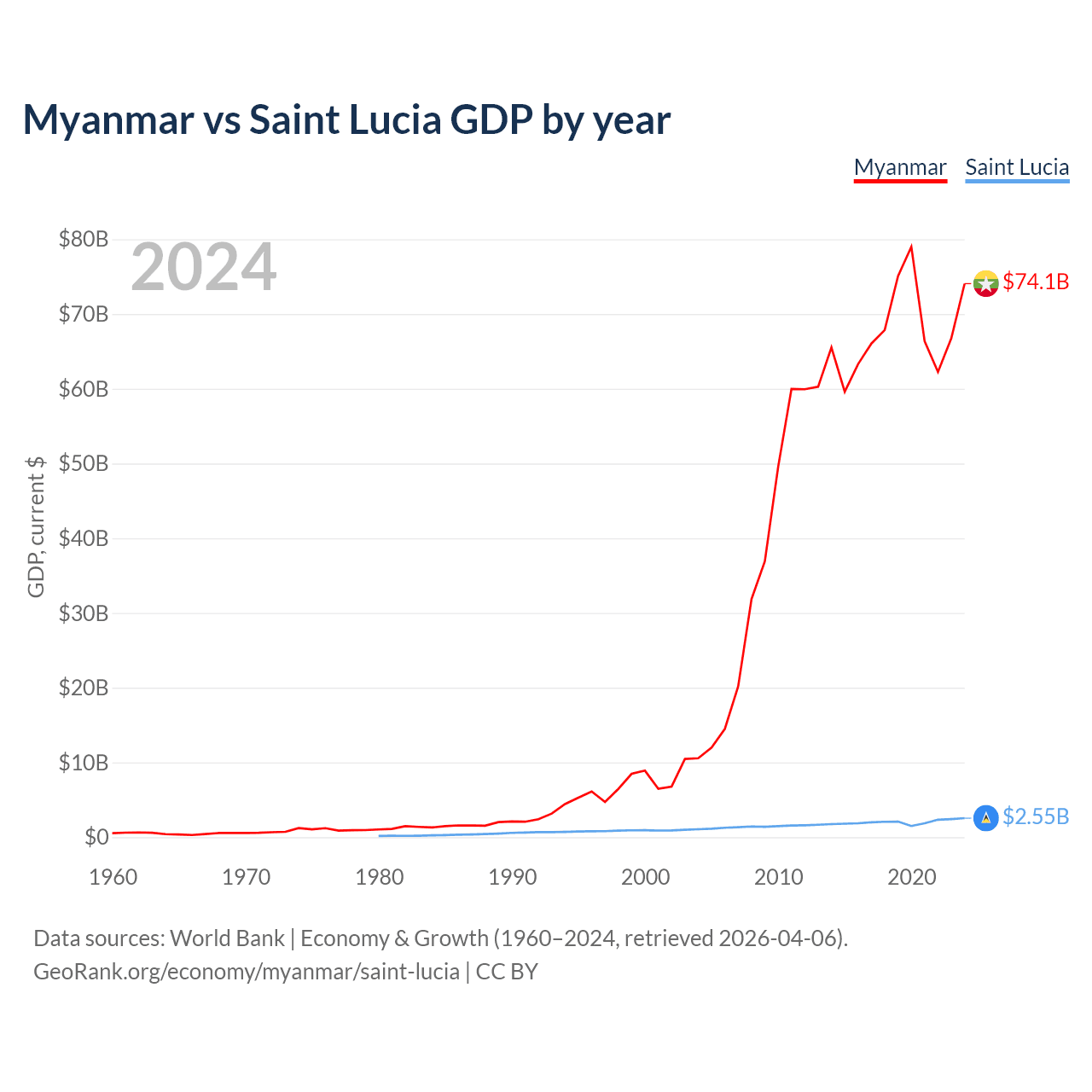 Myanmar has a GDP of $74.1B compared to $2.55B for Saint Lucia, ranking 85/197 and 173/197 by economy size, respectively.