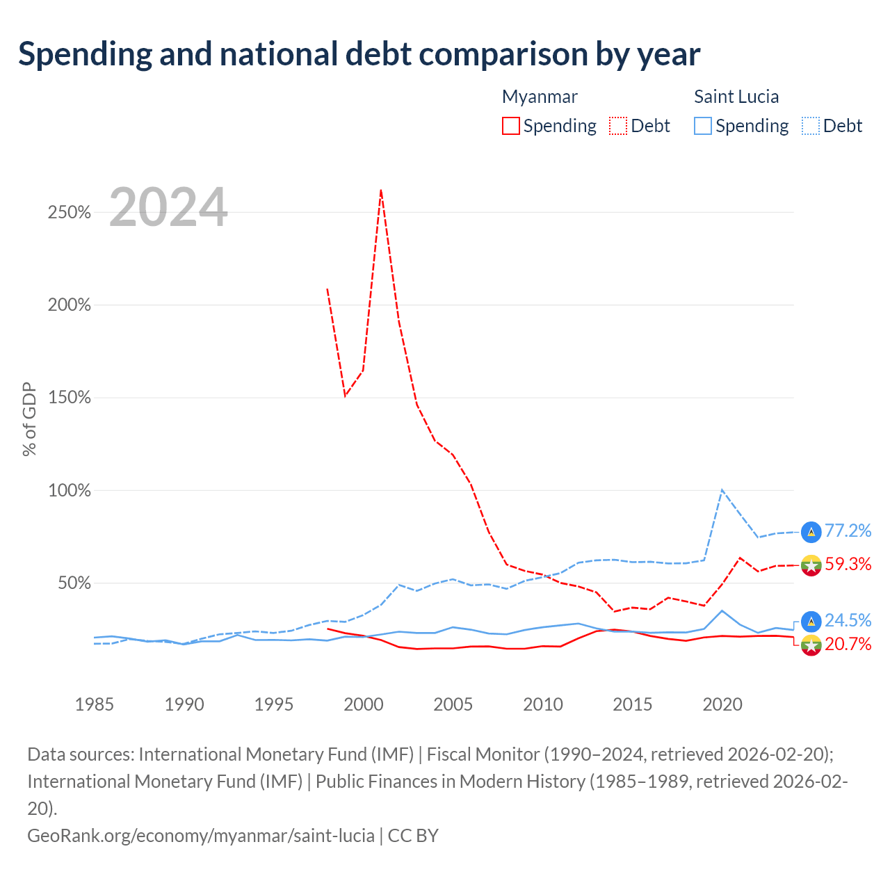 Myanmar has $44B in government debt (59.3% of GDP), compared to $1.97B (77.2% of GDP) in Saint Lucia.