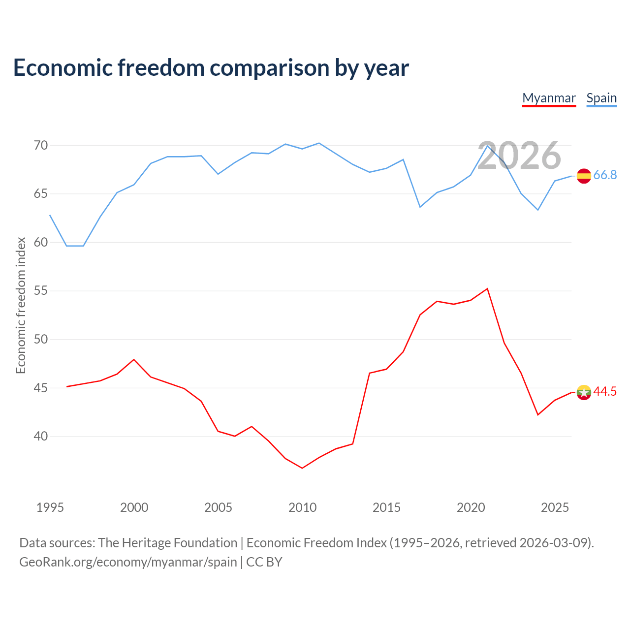 The Economic Freedom Index for Myanmar is 44.5, ranking 180/197, compared to 66.8 for Spain, ranking 59/197. The chart above displays a comparison of annual changes in economic freedom indexes.