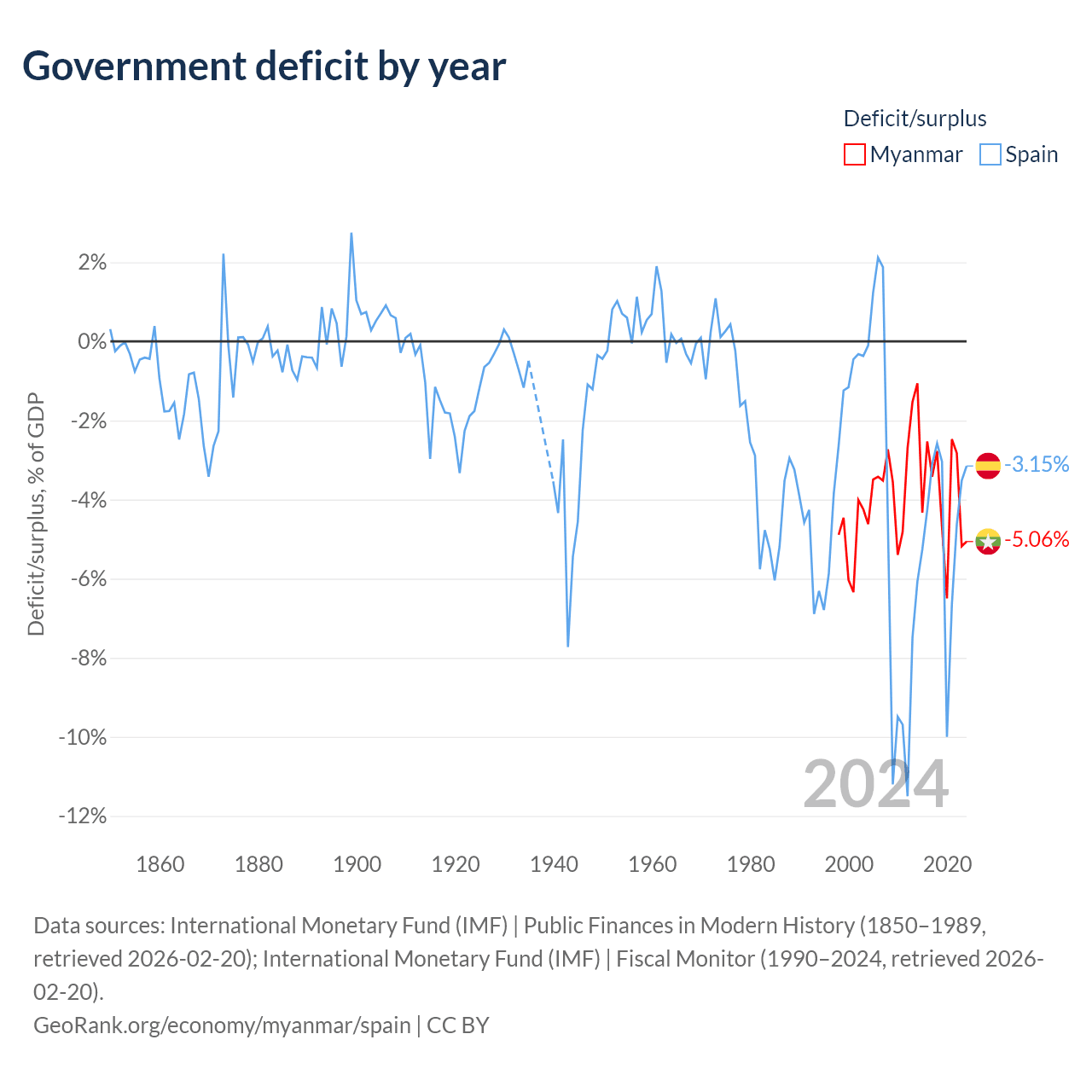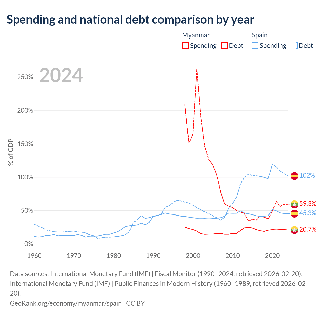 Myanmar has $44B in government debt (59.3% of GDP), compared to $1.75T (101.6% of GDP) in Spain.