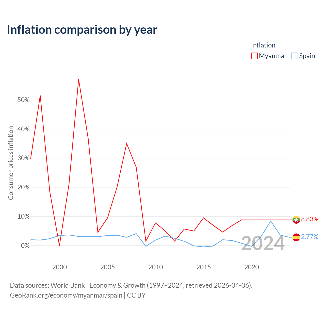 Myanmar has a GDP of $74.1B compared to $1.73T for Spain, ranking 85/197 and 15/197 by economy size, respectively.