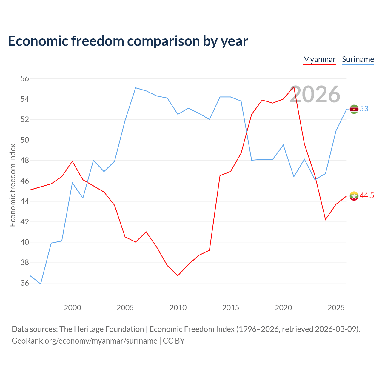 The Economic Freedom Index for Myanmar is 44.5, ranking 180/197, compared to 53 for Suriname, ranking 143/197. The chart above displays a comparison of annual changes in economic freedom indexes.