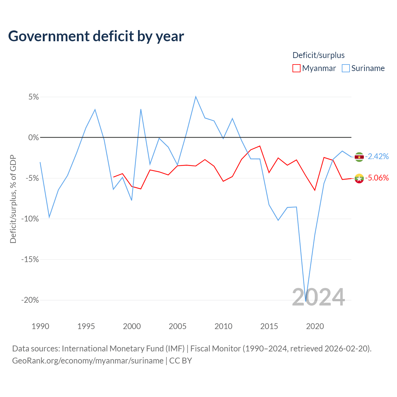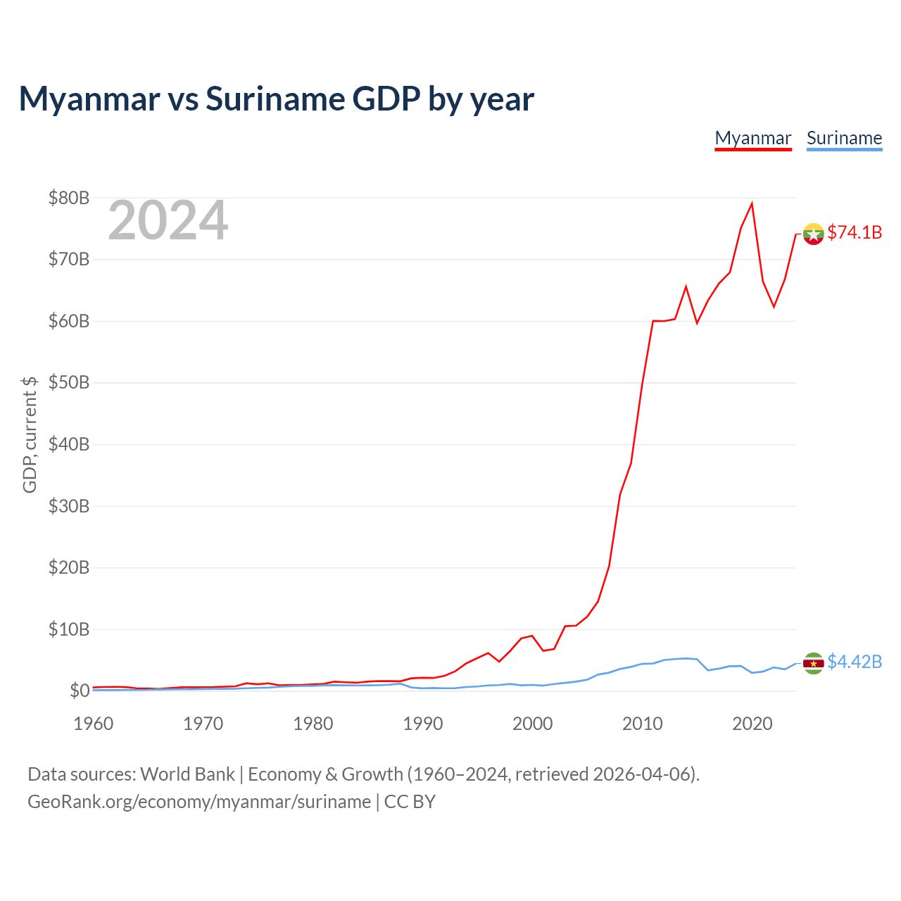 Myanmar has a GDP of $74.1B compared to $4.42B for Suriname, ranking 85/197 and 164/197 by economy size, respectively.