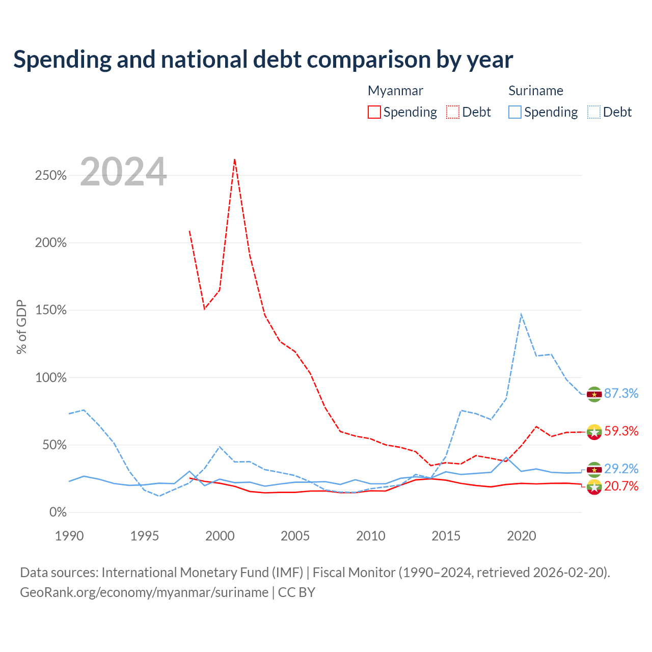 Myanmar has $44B in government debt (59.3% of GDP), compared to $3.86B (87.3% of GDP) in Suriname.